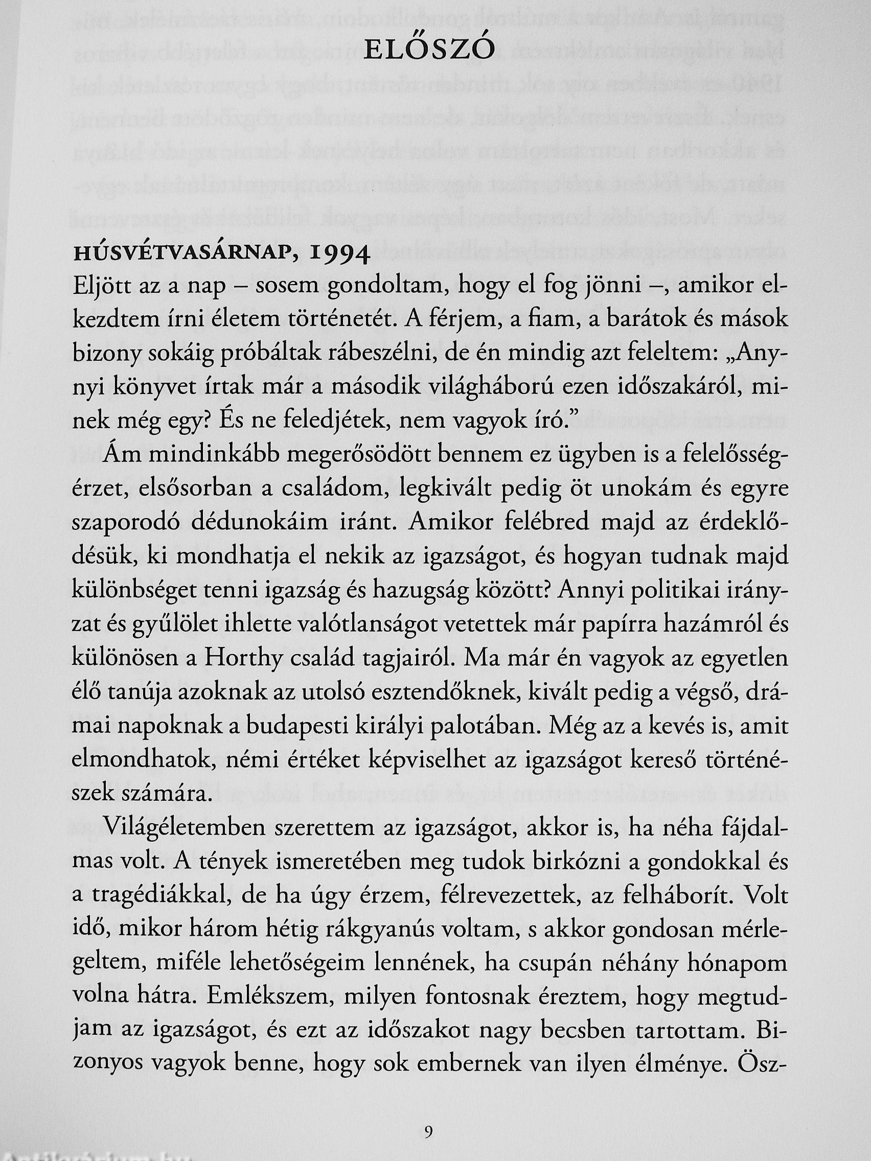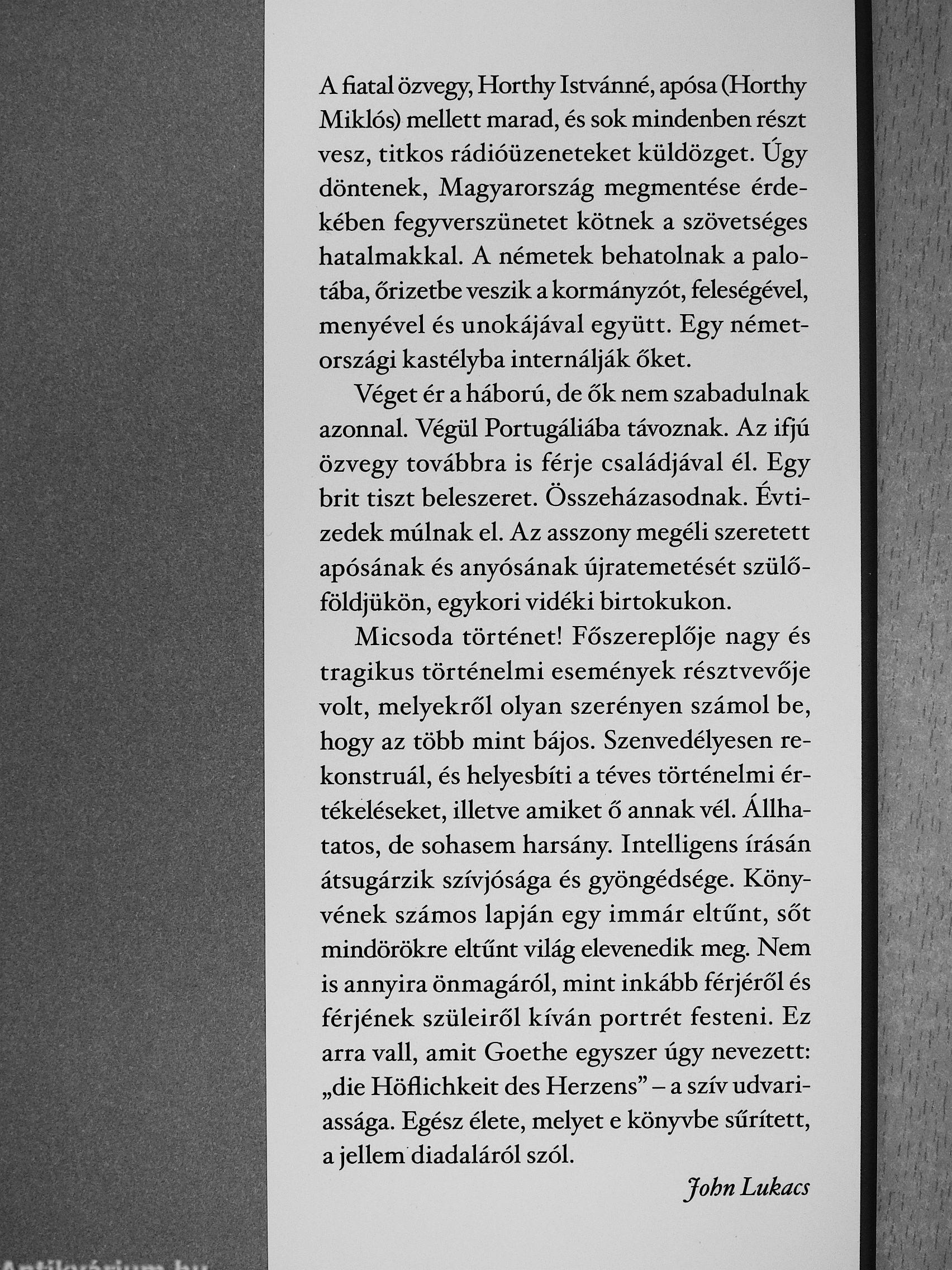 Micsoda történet! Főszereplője nagy és tragikus történelmi események résztvevője volt, melyekről olyan szerényen számol be, hogy az több mint bájos. Szenvedélyesen rekonstruál, és helyesbíti a téves történelmi értékeléseket, illetve amiket ő annak vél. Állhatatos, de sohasem harsány. Intelligens írásán átsugárzik szívjósága és gyöngédsége. Könyvének számos lapján egy immár eltűnt, sőt mindörökre eltűnt világ elevenedik meg. Nem is annyira önmagáról, mint inkább férjéről és férjének szüleiről kíván portrét festeni. Ez arra vall, amit Goethe egyszer úgy nevezett: „die Höflichkeit des Herzens" - a szív udvariassága. Egész élete, melyet e könyvbe sűrített, a jellem diadaláról szól.