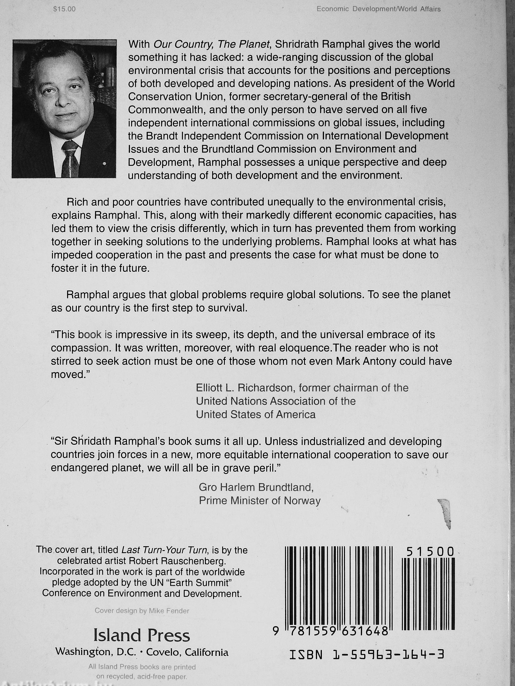 With Our Country, The Planet, Shridrath Ramphal gives the world something it has lacked: a wide-ranging discussion of the global environmental crisis that accounts for the positions and perceptions of both developed and developing nations. As president of the World Conservation Union, former secretary-general of the British Commonwealth, and the only person to have served on all five independent international commissions on global issues, including the Brandt Independent Commission on International Development Issues and the Brundtland Commission on Environment and Development, Ramphal possesses a unique perspective and deep understanding of both development and the environment.