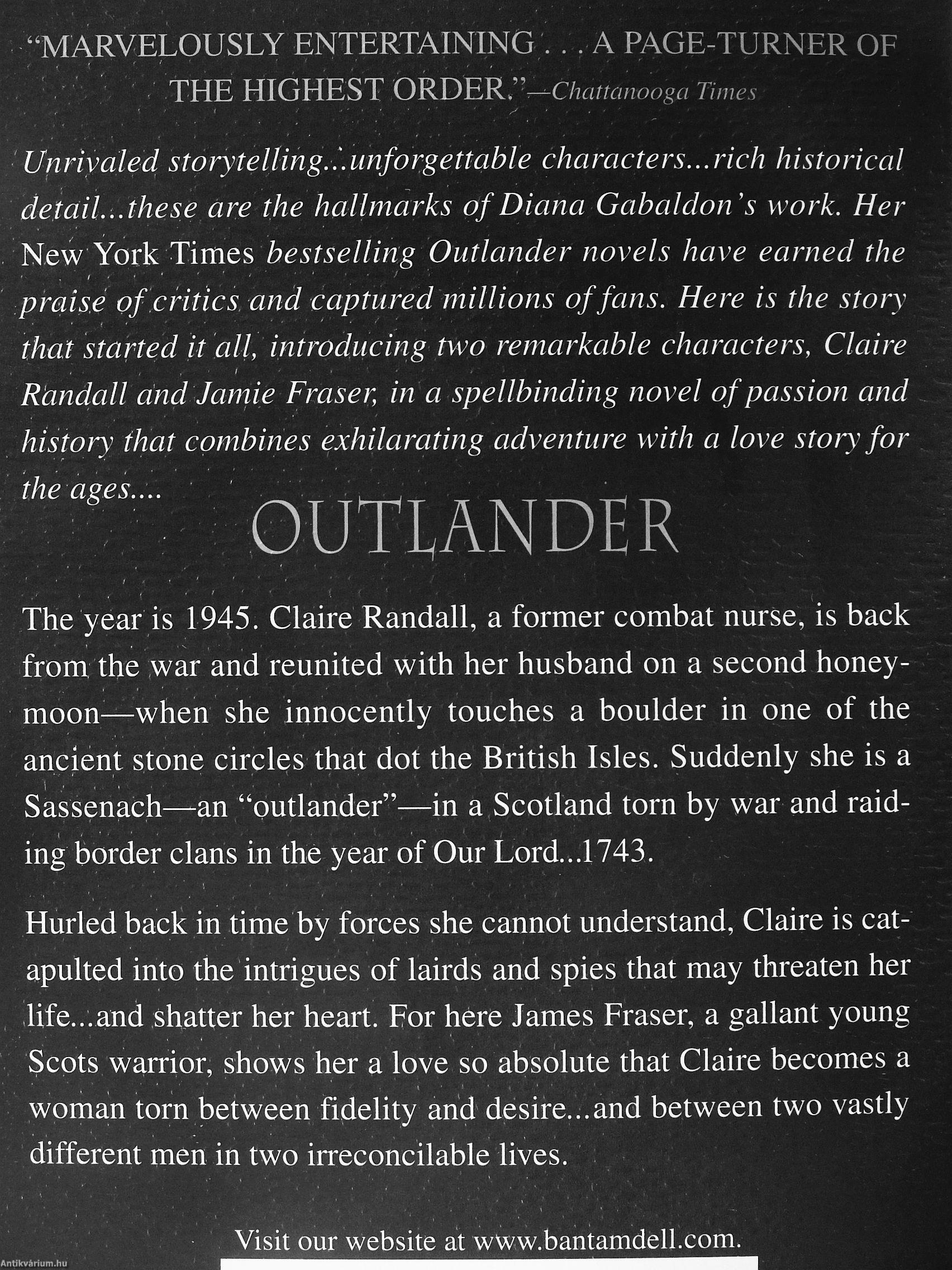 The year is 1945. Claire Randall, a former combat nurse, is back from the war and reunited with her husband on a second honeymoon—when she innocently touches a boulder in one of the ancient stone circles that dot the British Isles. Suddenly she is a Sassenach—an "outlander"—in a Scotland torn by war and raiding border clans in the year of Our Lord 1743.