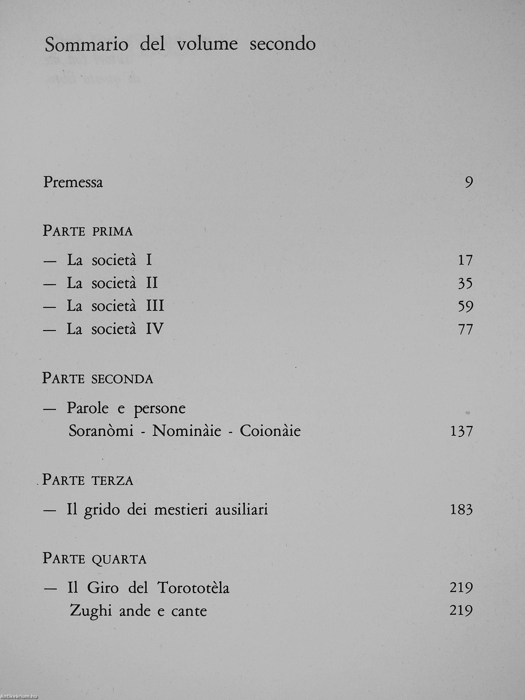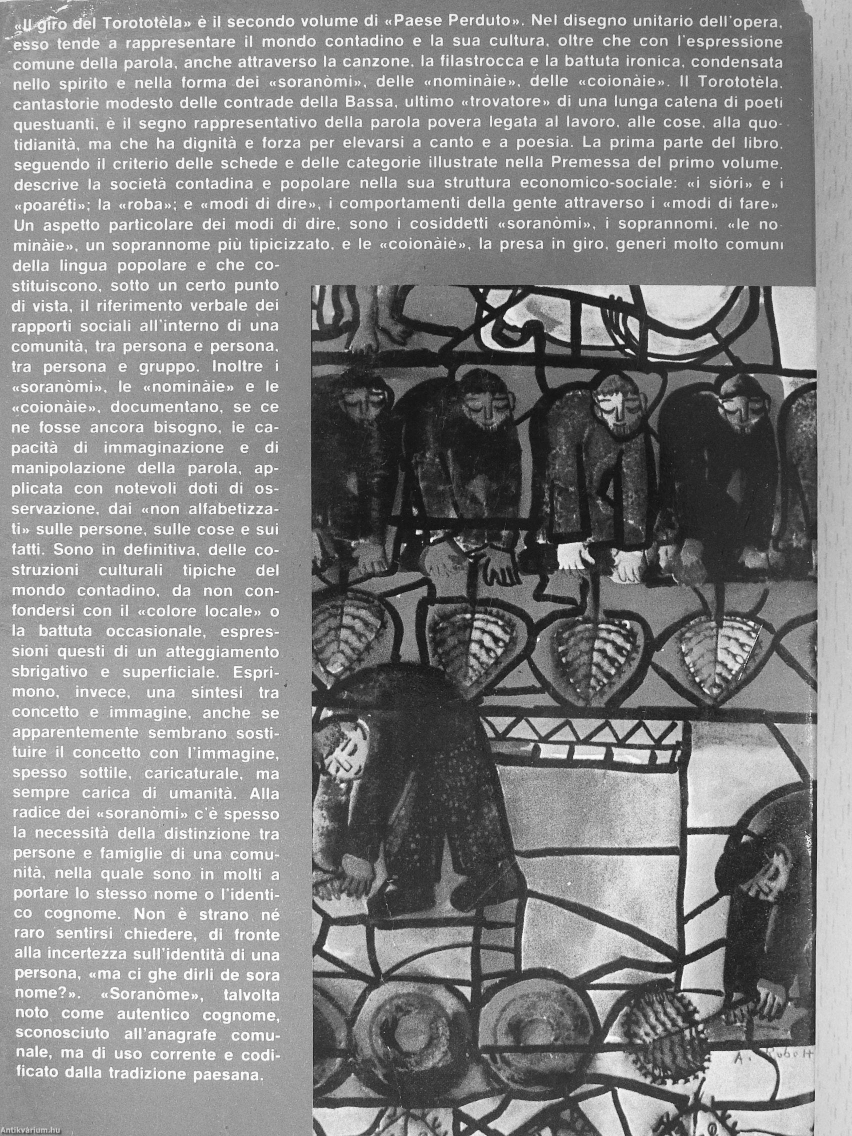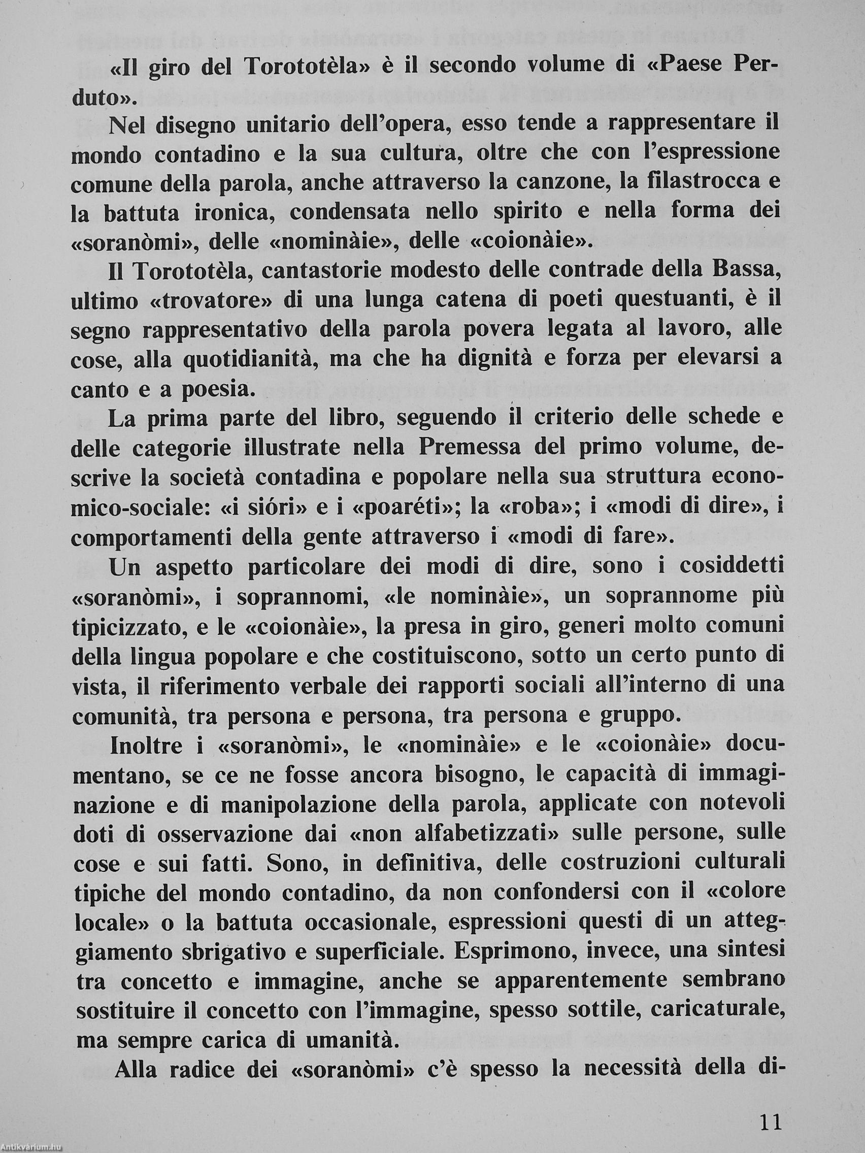 «Ipgîro dél Torototéla» e il secondo volume di Paese Perduto». Nel disegno unitario dell'opera, esso tende a rappresentare il mondo contadino e la sua cultura, ollre che con l'espresslone comune della parola, anche attraverso la canzone, la filastrocca e la battuta Irónica, condénsala nello spirito e nella forma dei soranômi», delle «nominaie». delle coionaie». li Torototéla. cantastorie modesto delle contrade della Bassa, ultimo trovatore» di una lunga catena di poeti questuanti. e il segno rappresentativo della parola povera legata al lavoro. aile cose, alla quo-tidianita, ma che ha dignita e torza per elevarsi a canto e a poesía. La prima parte del libro, seguendo il criterio delle schede e delle catégorie illustrate nella Premessa del primo volume, descrive la societa contadina e popolare nella sua struttura economico-sociale; i sióri» e i poaréti»; la roba»; e modi di dire», i comportamenti della gente attraverso i modi di tare» Un aspetto particolare dei modi di dire, sono i cosiddetti «soranômi», i soprannomi. le no minaie», un soprannome piu tipicizzato. e le «coionaie», la presa in giro, generi molto comuni della lingua popolare e che co-