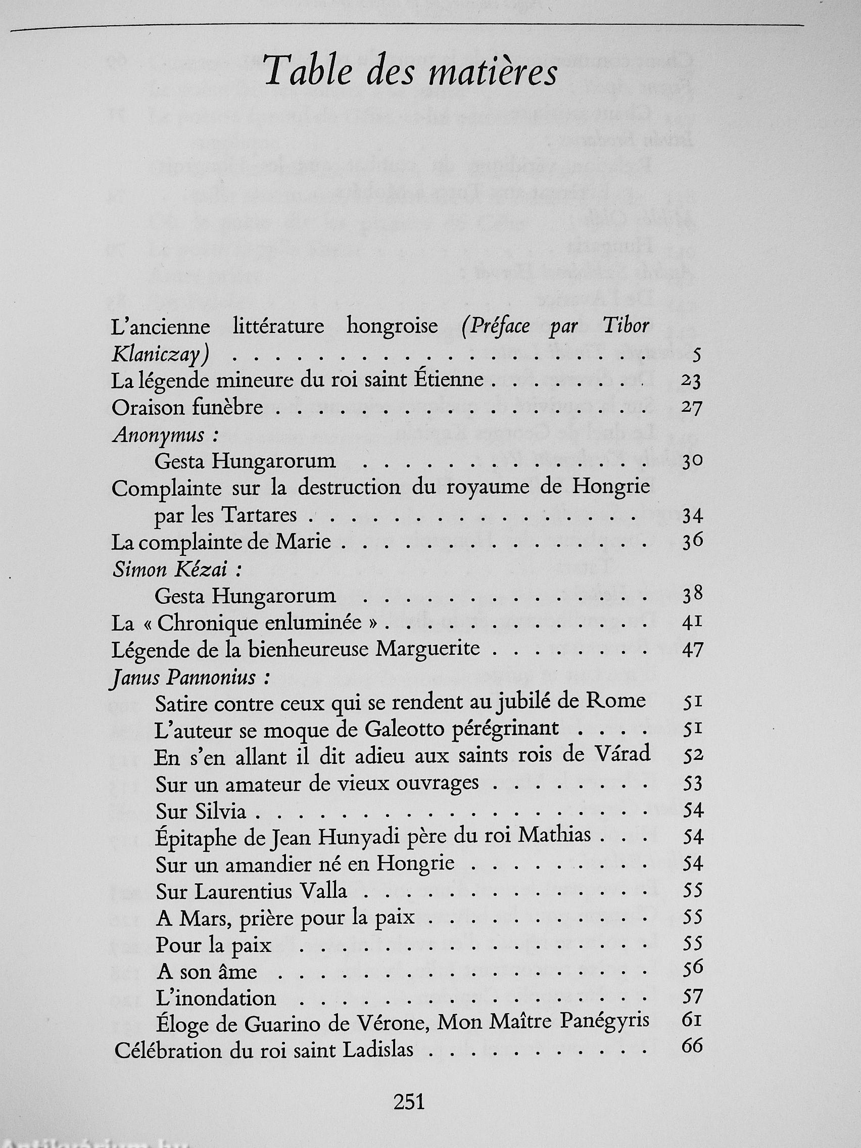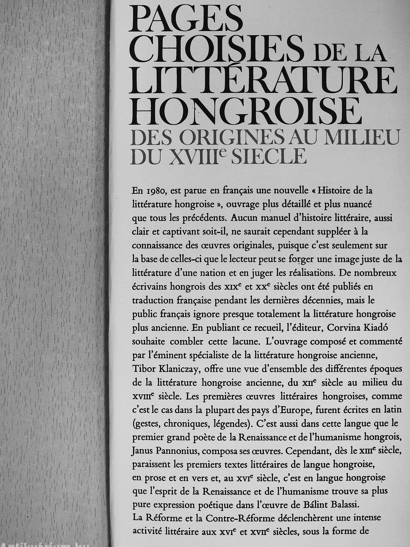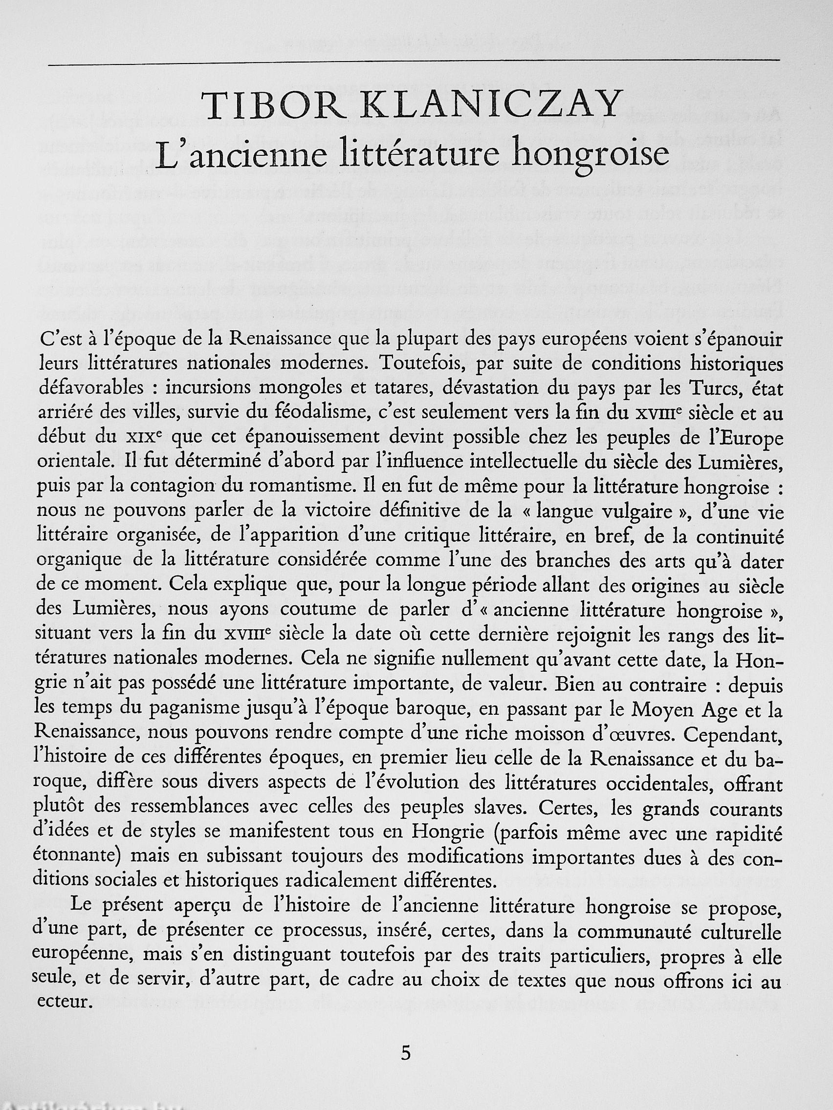 En 1980, est parue en français une nouvelle « Histoire de la littérature hongroise », ouvrage plus détaillé et plus nuancé que tous les précédents. Aucun manuel d'histoire littéraire, aussi clair et captivant soit-il, ne saurait cependant suppléer a la connaissance des ouvres originales, puisque c'est seulement sur la base de celles-ci que le lecteur peut se forger une image juste de la littérature d'une nation et en juger les réalisations. De nombreux écrivains hongrois des xix® et xx® siecles ont été publiés en traduction française pendant les dernieres décennies, mais le public français ignore presque totalement la littérature hongroise plus ancienne. En publiant ce recueil, l'éditeur, Corvina Kiadó souhaite combler cette lacune. L'ouvrage composé et commenté par l'éminent spécialiste de la littérature hongroise ancienne, Tibor Klaniczay, offre une vue d'ensemble des différentes époques de la littérature hongroise ancienne, du xtf siecle au milieu du xvin® siecle. Les premieres ouvres littéraires hongroises, comme c'est le cas dans la plupart des pays d'Europe, furent écrites en latin (gestes, chroniques, légendes). C'est aussi dans cette langue que le premier grand poete de la Renaissance et de l'humanisme hongrois, Janus Pannonius, composa ses ouvres. Cependant, des le xni® siecle, paraissent les premiers textes littéraires de langue hongroise, en prose et en vers et, au xvi® siecle, c'est en langue hongroisp que l'esprit de la Renaissance et de l'humanisme trouve sa plus pure expression poétique dans l'ouvre de Bálint Balassi. La Réforme et la Contre-Réforme déclencherent une intense activité littéraire aux xvi® et xvn® siecles, sous la forme de