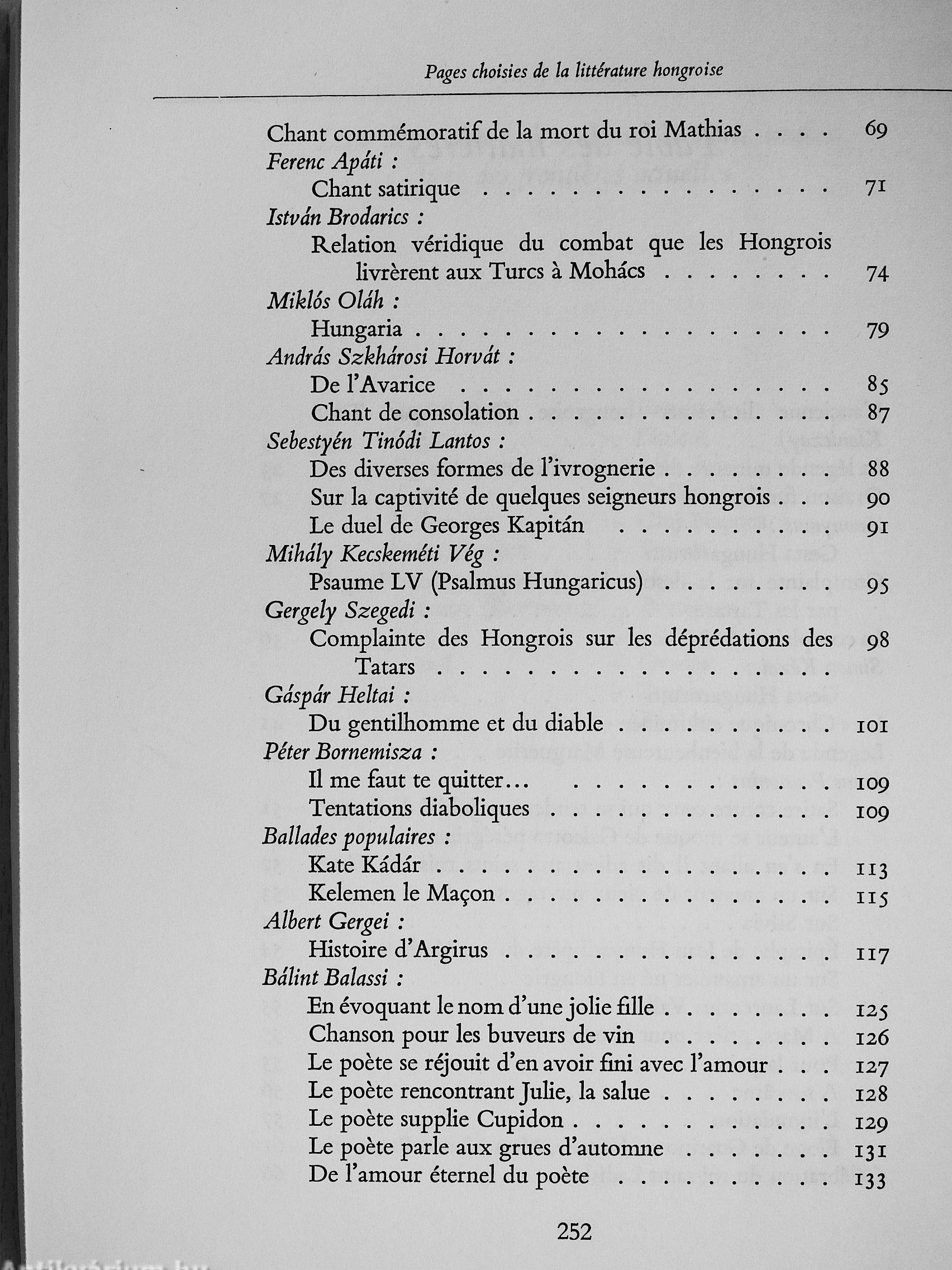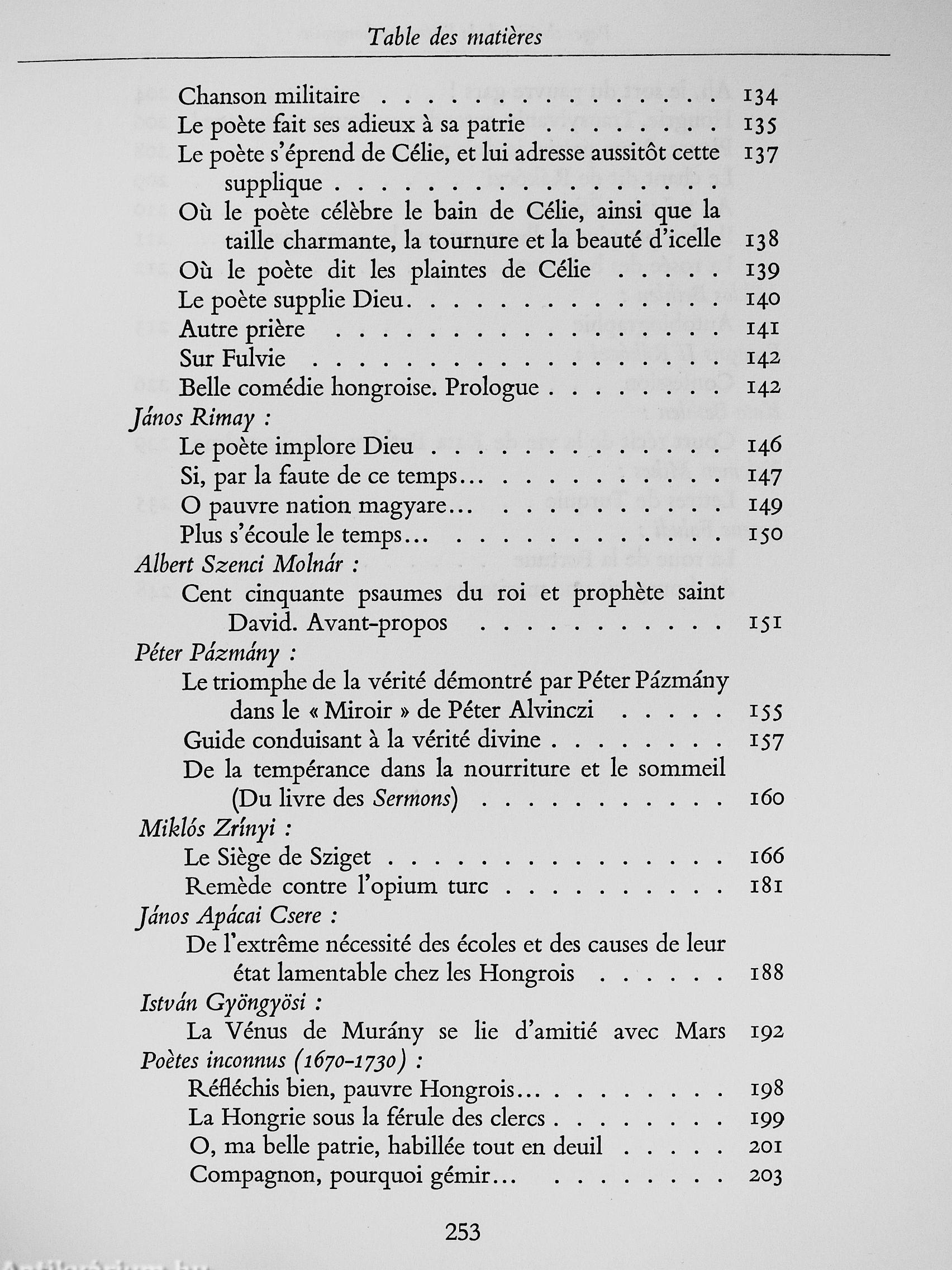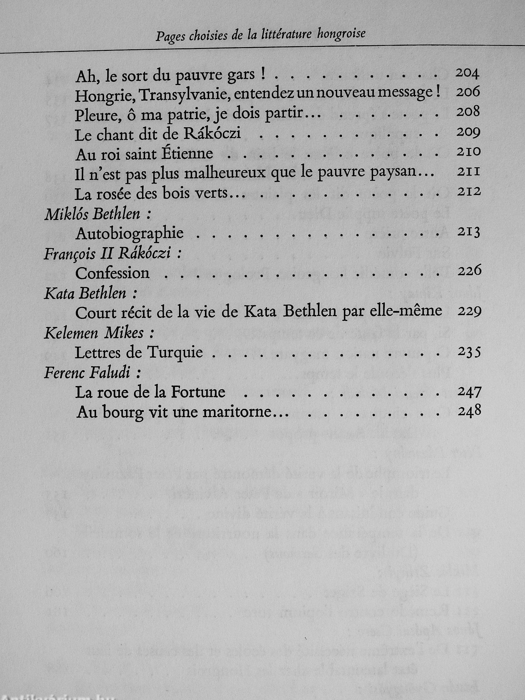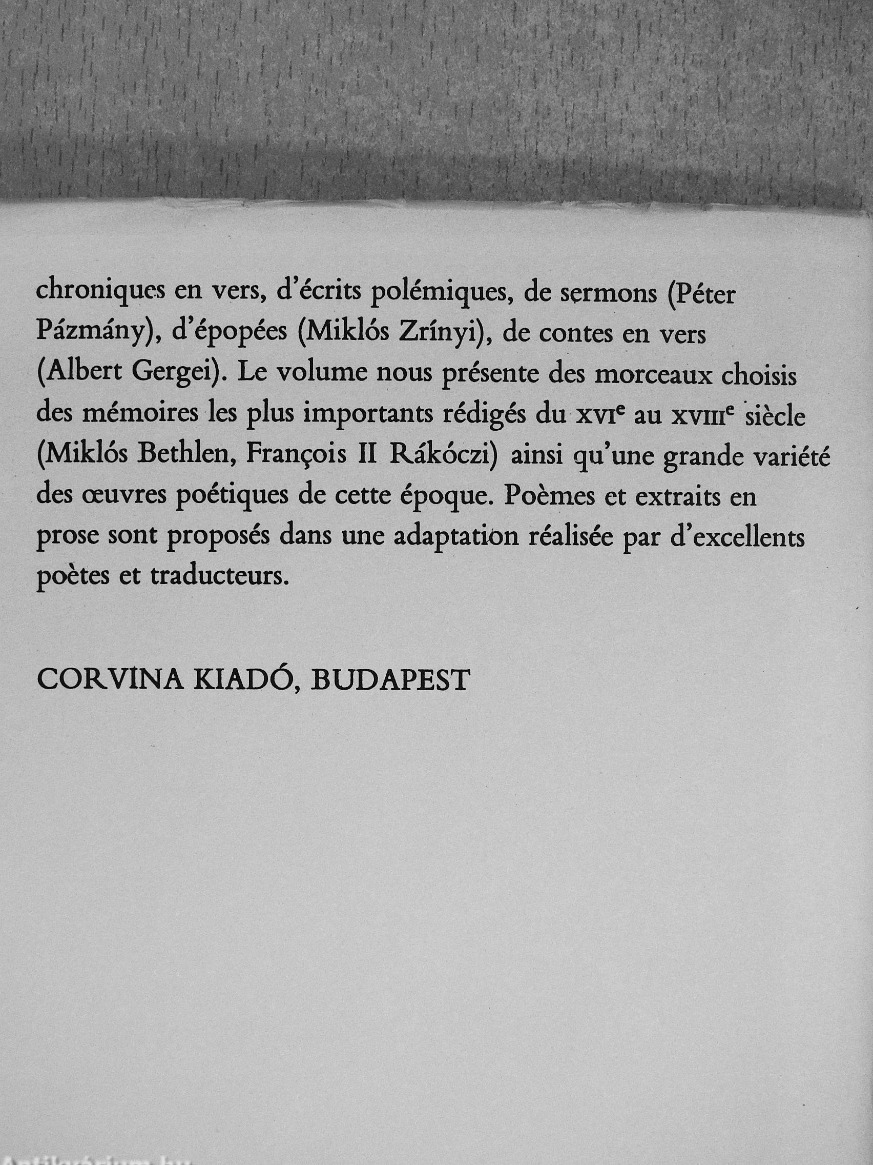 chroniques en vers, d'écrits polémiques, de sermons (Péter Pázmány), d'épopées (Miklós Zrínyi), de contes en vers (Albert Gergei). Le volume nous présente des morceaux choisis des mémoires les plus importants rédigés du xvi® au xvm^ siecle (Miklós Bethlen, François II Rákóczi) ainsi qu'une grande variété des ouvres poétiques de cette époque. Poemes et extraits en prose sont proposés dans une adaptation réalisée par d'excellents poetes et traducteurs.
