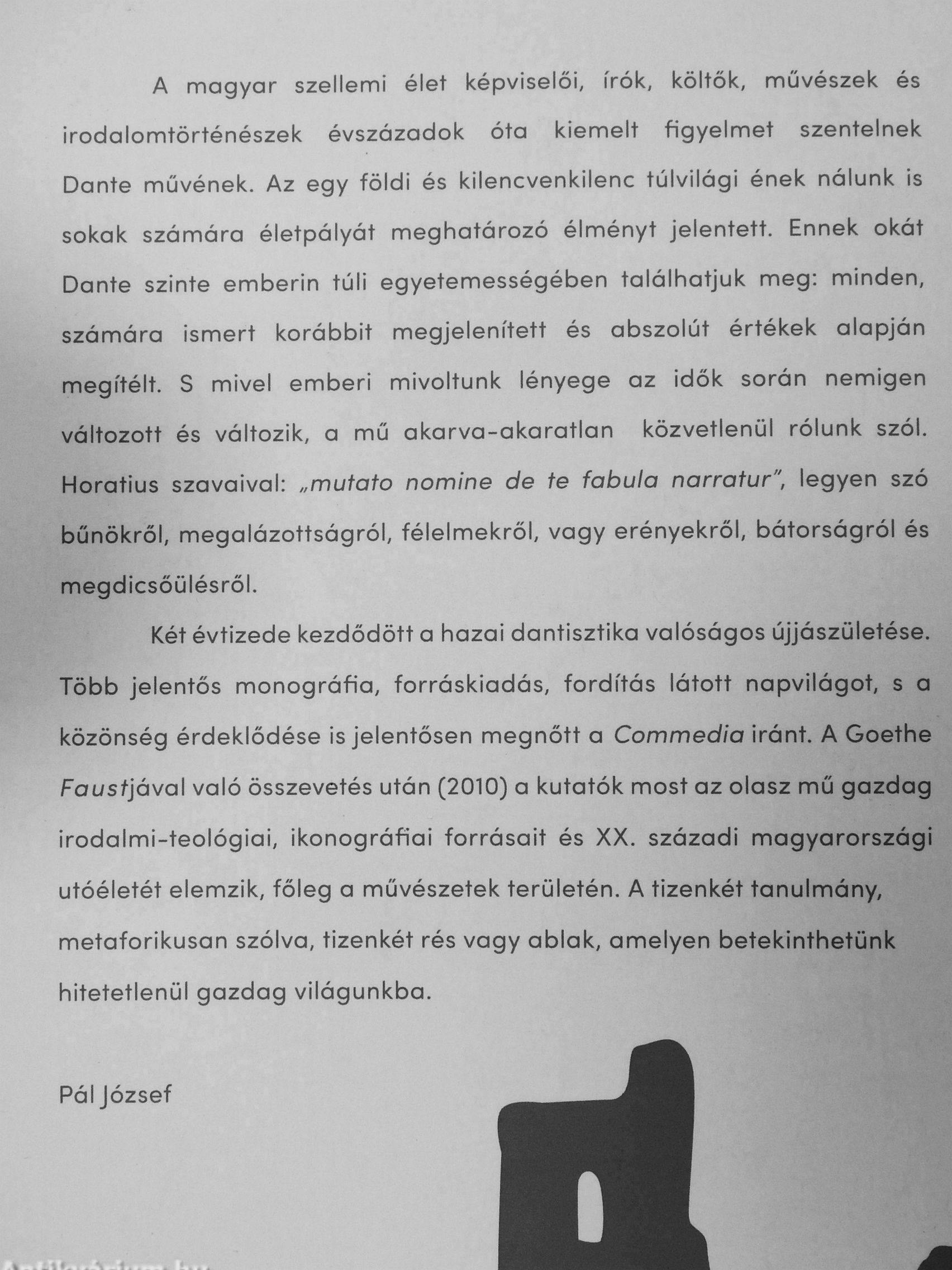 Két évtizede kezdődött a hazai dantisztika valóságos újjászületése. Több jelentős monográfia, forráskiadás, fordítás látott napvilágot, s a közönség érdeklődése is jelentősen megnőtt a Commedia iránt. A Goethe Fousfjóval való összevetés utón (2010) a kutatók most az olasz mű gazdag irodalmi-teológiai, ikonográfiái forrósait és XX. századi magyarországi utóéletét elemzik, főleg a művészetek területén. A tizenkét tanulmány, metaforikuson szólva, tizenkét rés vagy ablak, amelyen betekinthetünk hitetetlenül gazdag világunkba.