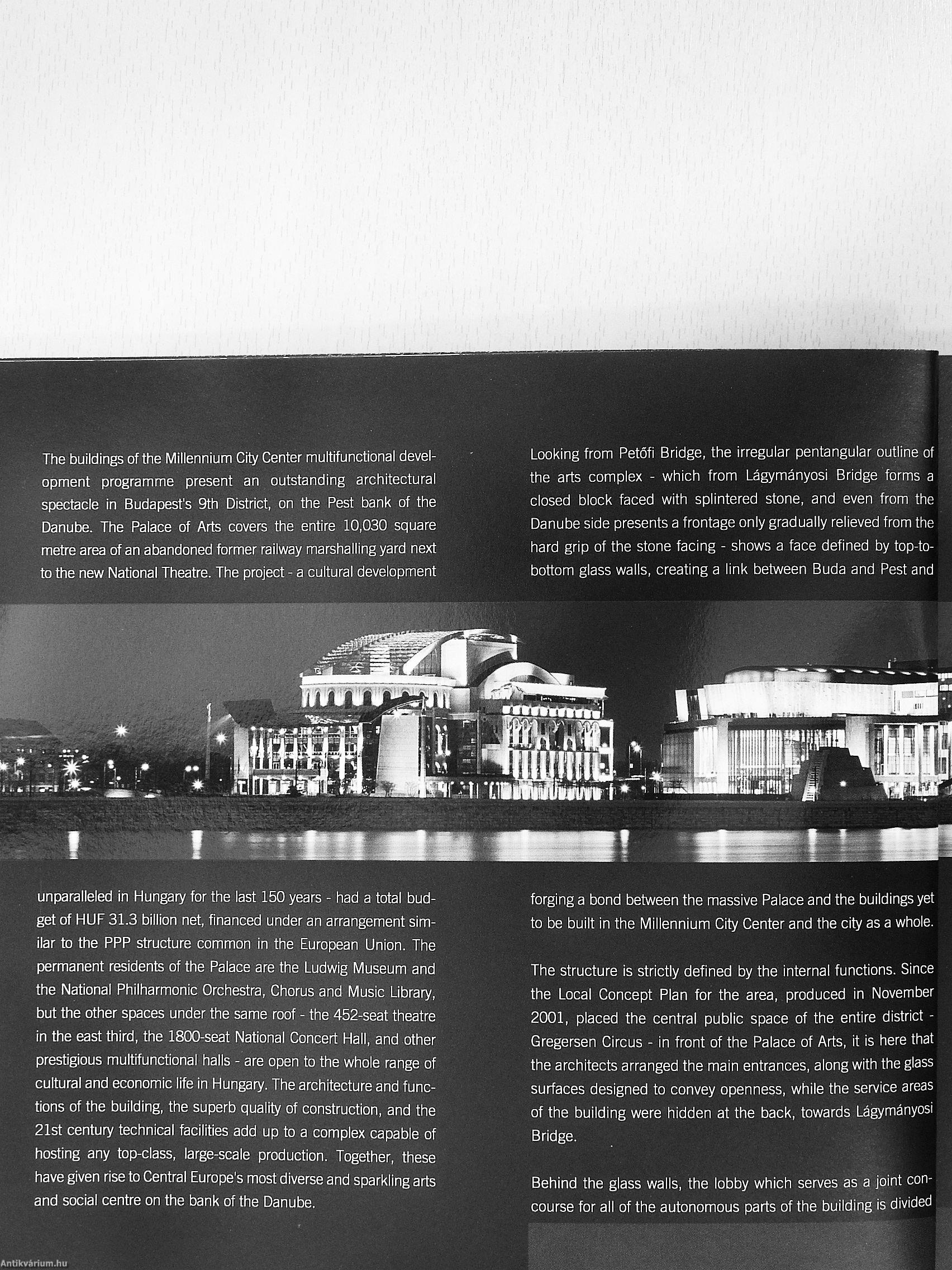 Now that we are members of the European Union, we have an obligation, in addition to preserving our cultural identity and values, to create opportunity and facilities for creative artistic work, to turn art works into public property and to disseminate them. This is the philosophy behind what is undoubtedly Hungary's most significant development for arts in the last hundred years. Opened on 14 March 2005, the Palace of Arts, built through effective cooperation between the private and public sectors, is a place worthy of Hungarian music, fine art, theatre, dance and architecture, and joins the establishments of similar significance in the Millennium City Center.