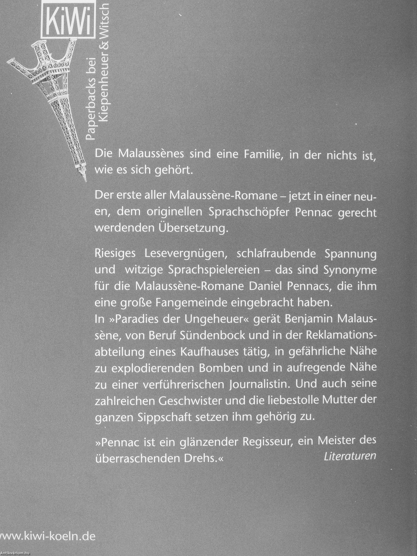 Riesiges Lesevergnügen, schlafraubende Spannung und witzige Sprachspieiereien - das sind Synonyme für die Malaussene-Romane Daniel Pennacs, die ihm eine große Fangemeinde eingebracht haben. In »Paradies der Ungeheuer« gerät Benjamin Malaus-sene, von Beruf Sündenbock und in der Reklamationsabteilung eines Kaufhauses tätig, in gefährliche Nähe zu explodierenden Bomben und in aufregende Nähe zu einer verführerischen Journalistin. Und auch seine zahlreichen Geschwister und die liebestolie Mutter der ganzen Sippschaft setzen ihm gehörig zu.