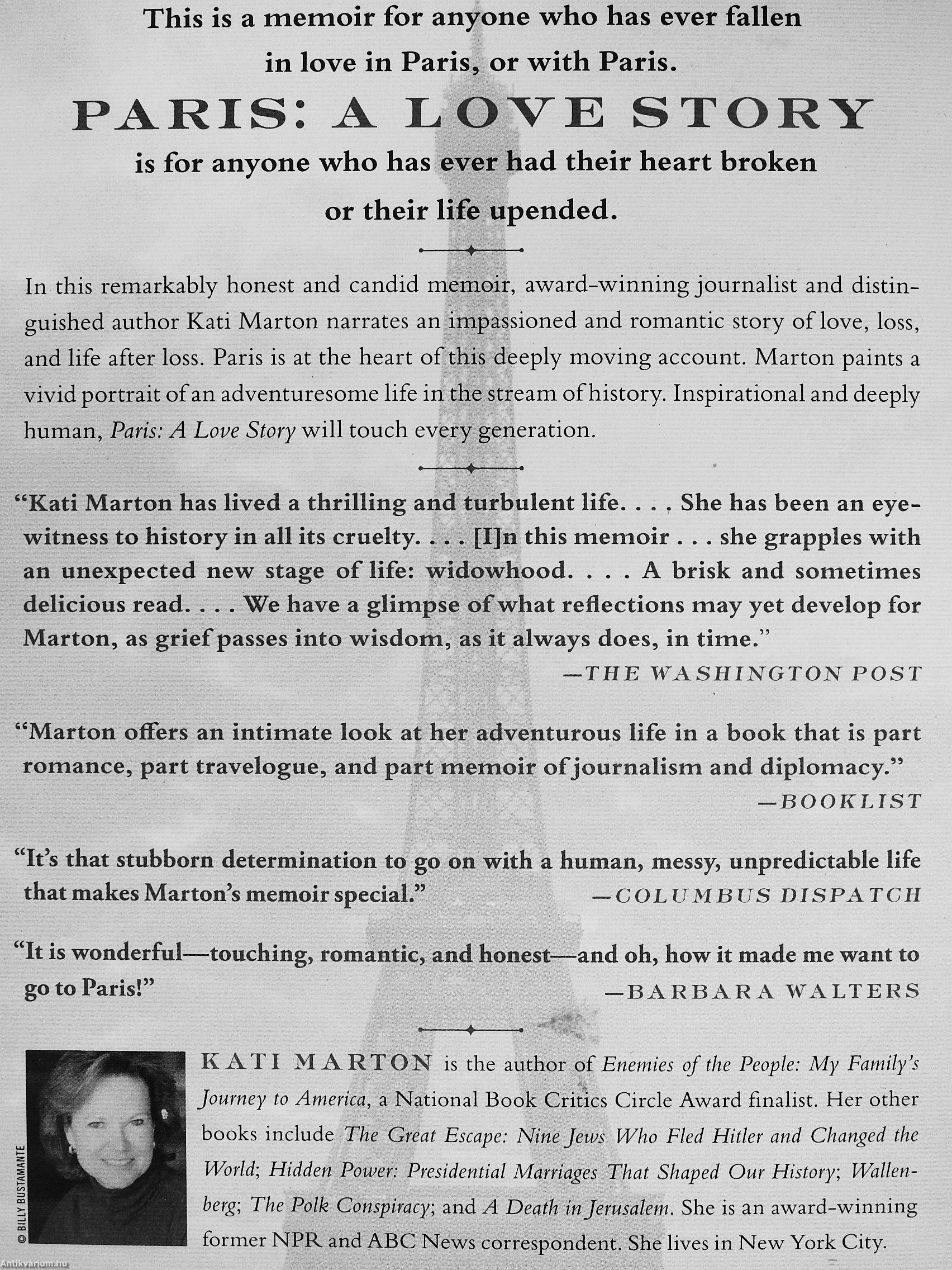 In this remarkably honest and candid memoir, award-winning journalist and distinguished author Kati Marton narrates an impassioned and romantic story of love, loss, and life after loss. Paris is at the heart of this deeply moving account. Marton paints a vivid portrait of an adventuresome life in the stream of history. Inspirational and deeply human, Paris: A Love Story will touch every generation.
