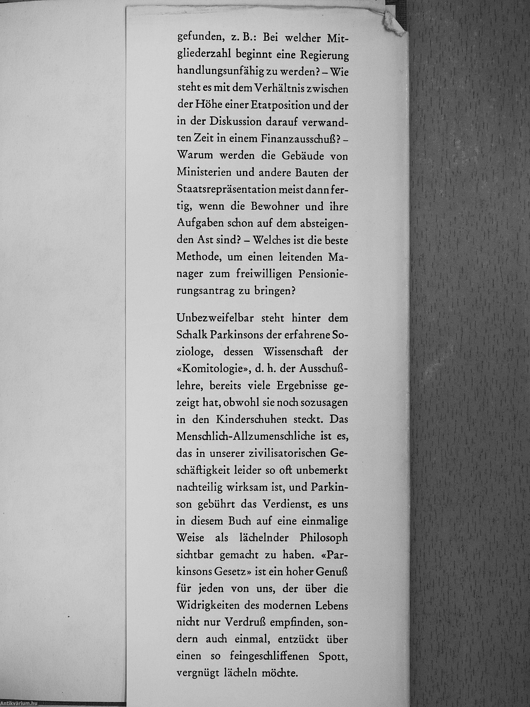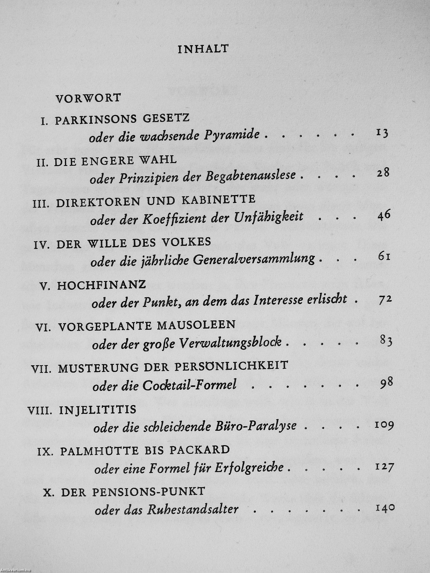 Aber Parkinson hat sich nidit nur mit dem eigenartigen Gesetz der Vermehrung der Bürokratie, sondern ebenso mit den merkwürdigen Gesetzlichkeiten beschäftigt, nach denen administrative Ausschüsse als sich mehrende Hilfsorganisationen unseres Massendaseins genauso arbeiten wie zahlreiche andere Erscheinungen unseres öffentlichen und gesellschaftlichen Lebens. Er schildert sowohl die Tätigkeit der Volksvertreter als auch die Psychologie des Pensionsalters, sowohl die industrielle Bewerberauslese als auch die Entdeckung einer prominenten Persönlichkeit auf einer Cocktail-Party.