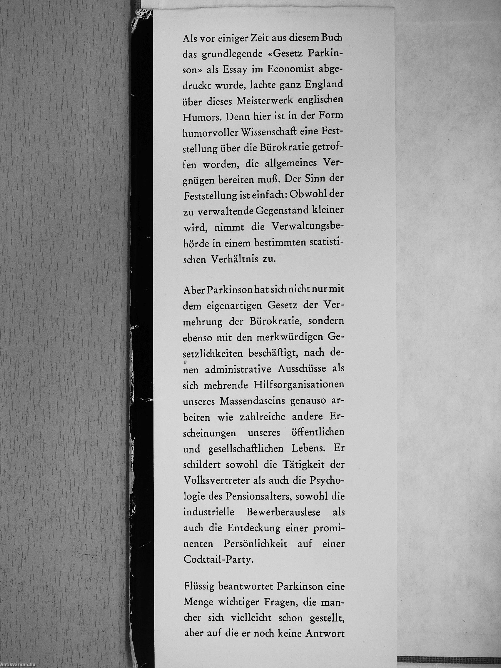 Als vor einiger Zeit aus diesem Budi das grundlegende «Gesetz Parkinson» als Essay im Economist abge-drudct wurde, ladite ganz England über dieses Meisterwerk englisdien Humors. Denn hier ist in der Form humorvoller Wissensdiaft eine Feststellung über die Bürokratie getroffen worden, die allgemeines Vergnügen bereiten muß. Der Sinn der Feststellung ist einfach: Obwohl der zu verwaltende Gegenstand kleiner wird, nimmt die Verwaltungsbehörde in einem bestimmten statistischen Verhältnis zu.