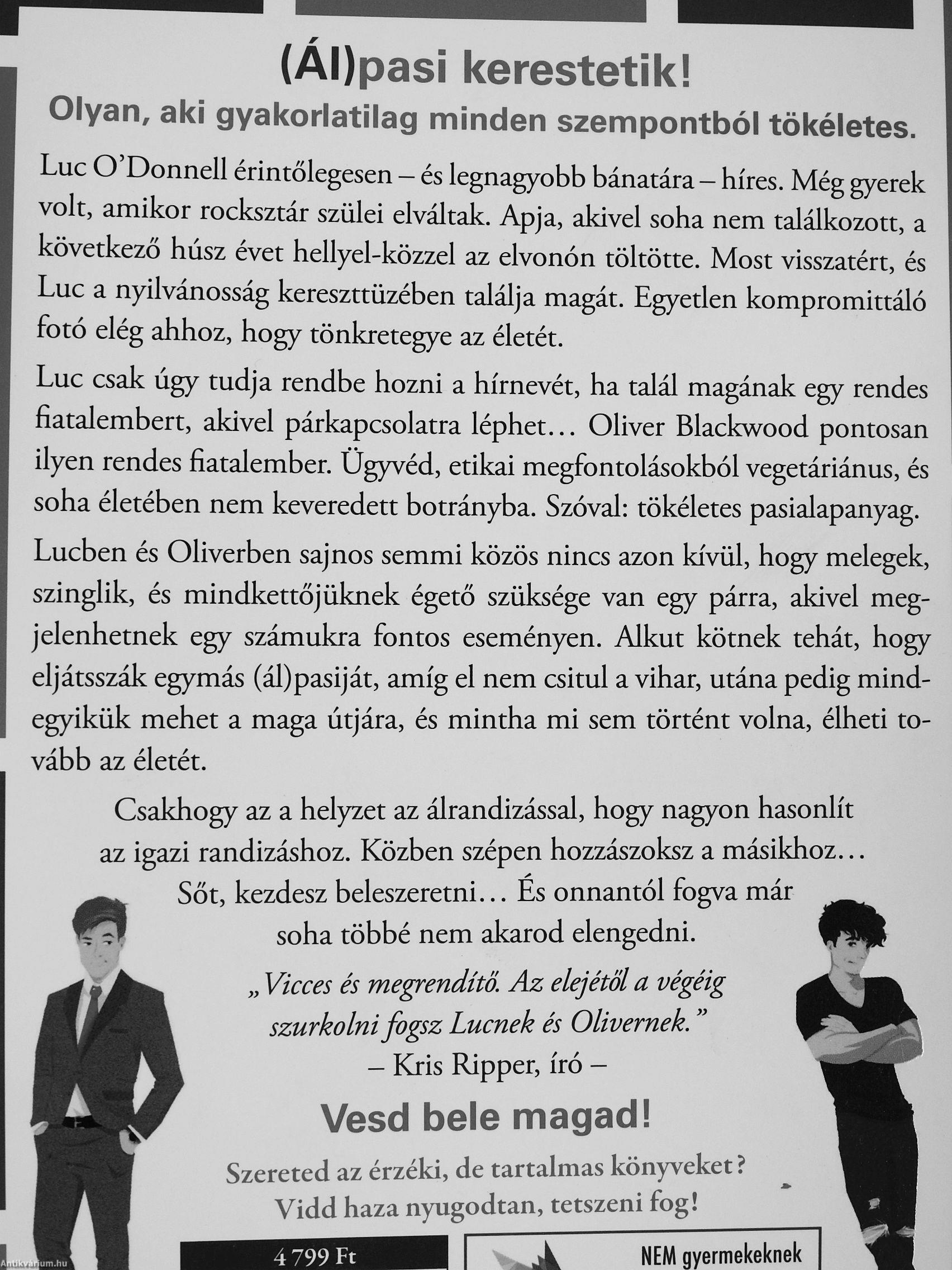 Luc csak úgy tudja rendbe hozni a hírnevét, ha talál magának egy rendes fiatalembert, akivel párkapcsolatra léphet Olivér Blackwood pontosan ilyen rendes fiatalember. Ügyvéd, etikai megfontolásokból vegetáriánus, és soha életében nem keveredett botrányba. Szóval: tökéletes pasialapanyag. Lucben és Oliverben sajnos semmi közös nincs azon kívül, hogy melegek, szinglik, és mindkettőjüknek égető szüksége van egy párra, akivel megjelenhetnek egy számukra fontos eseményen. Alkut kötnek tehát, hogy eljátsszák egymás (ál)pasiját, amíg el nem csitul a vihar, utána pedig...