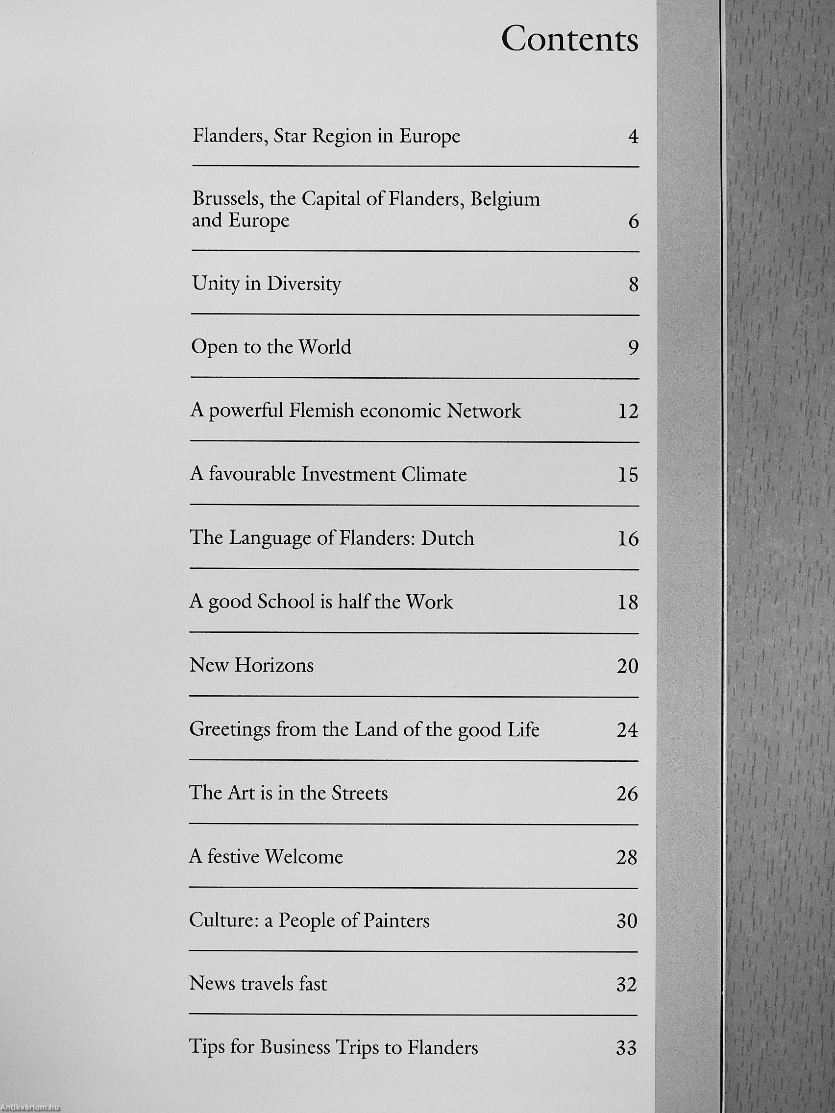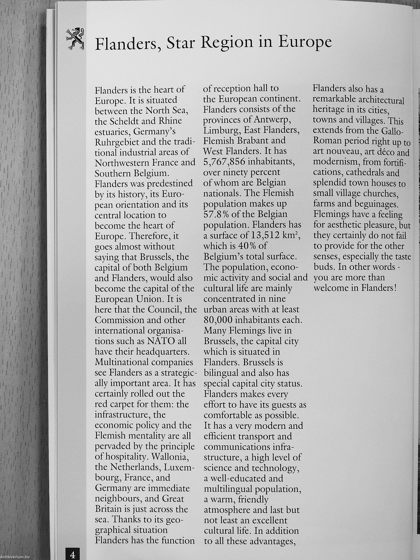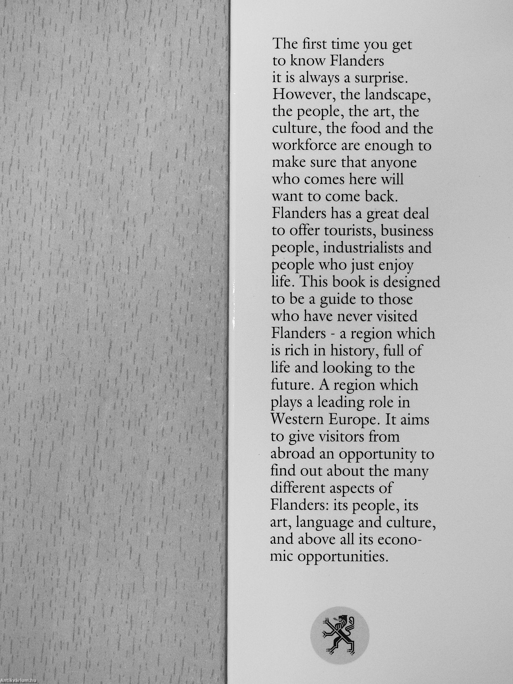 The first time you get to know Flanders it is always a surprise. However, the landscape, the people, the art, the culture, the food and the workforce are enough to make sure that anyone who comes here will want to come back. Flanders has a great deal to offer tourists, business people, industrialists and people who just enjoy life. This book is designed to be a guide to those who have never visited Flanders - a region which is rich in history, full of life and looldng to the future. A region which plays a leading role in Western Europe. It aims to give visitors from abroad an opportunity to find out about the many different aspects of Flanders: its people, its art, language and culture, and above all its economic opportunities.