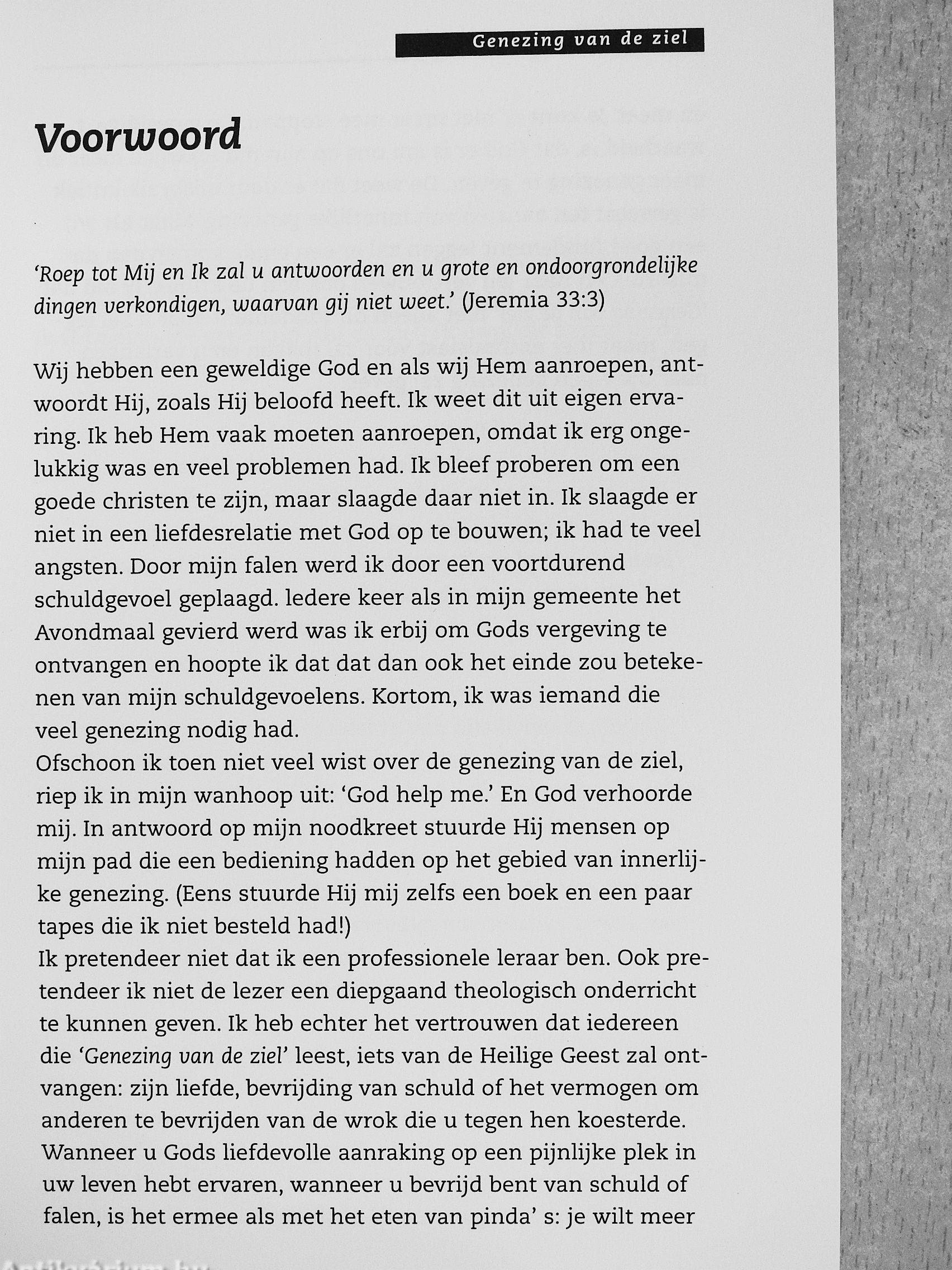 Het is nagenoeg onmogelijk om door dit leven te gaan zon-der op een of andere wijze verwond te ráken. Als deze onzichtíjare verwondiiígen niet behandeld worden, ráken zij geinfecteerd en gaan ze zweren. Het resultaat is pijn, eenzaamheid en onnist. Onze verwondingen maken het moeilijk, ja zelfs onmogelijk, om bevredigende relaties zowel met onszelf als met de Heer te onderhouden. Het Grote Nieuws is echter dat Jezus, door zijn dood aan het kruis de prijs betaalde voor onze volledige genezing. Dit proces, waardoor zo vele christenen tot hun grote vreugde bevrijd zijn van de innerlijke verwarring waarin zij een groot deel van hun leven hebben verkeerd, wordt 'genezing van de ziel' genöemd.