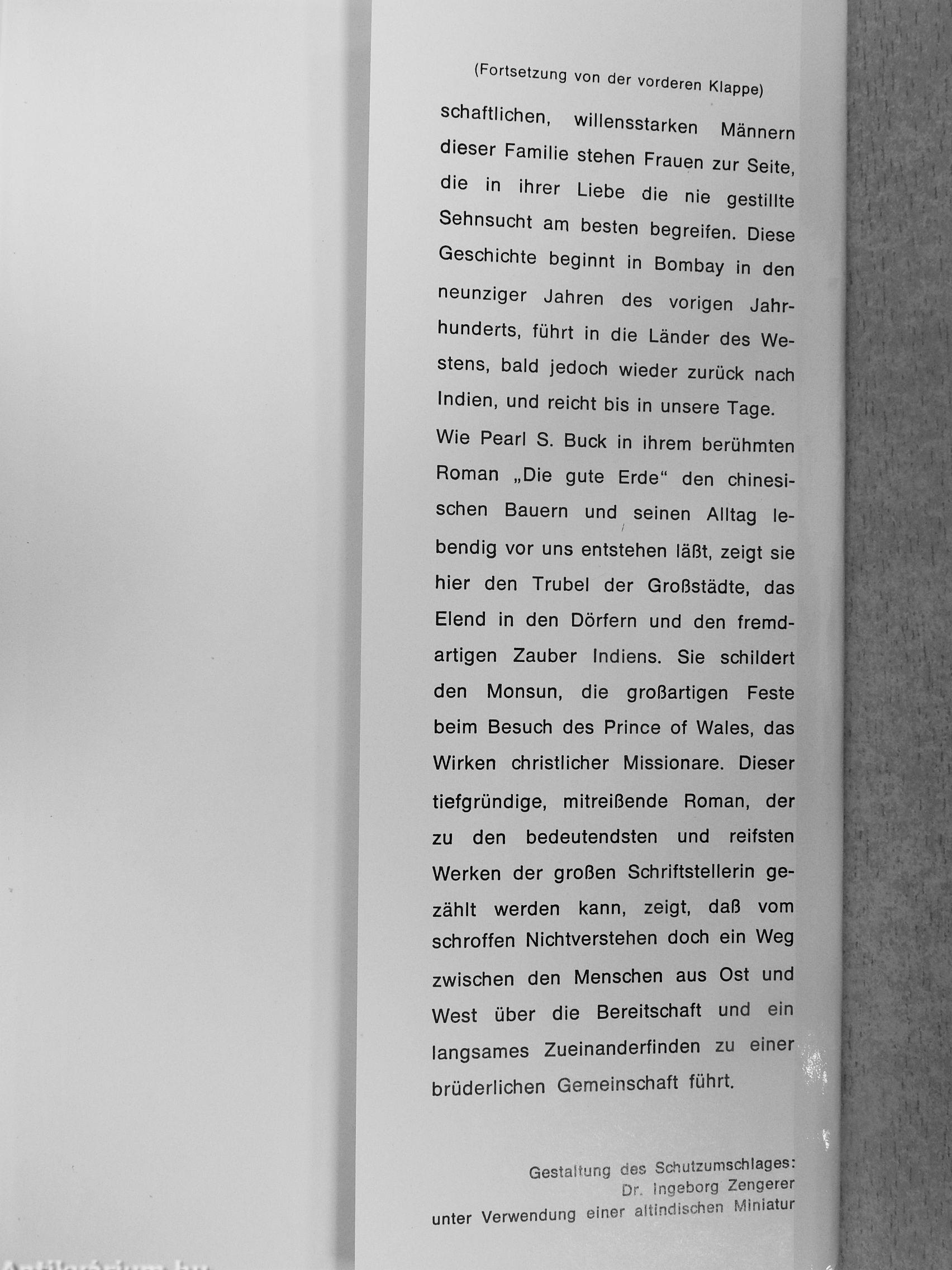 schaftlichen, willensstarken Männern dieser Familie stehen Frauen zur Seite, die in ihrer Liebe die nie gestillte Sehnsucht am besten begreifen. Diese Geschichte beginnt in Bombay in den neunziger Jahren des vorigen Jahrhunderts, führt in die Länder des Westens, bald jedoch wieder zurück nach Indien, und reicht bis in unsere Tage. Wie Pearl S. Buck in ihrem berühmten Roman „Die gute Erde" den chinesischen Bauern und seinen Alltag lebendig vor uns entstehen läßt, zeigt sie hier den Trubel der Großstädte, das Elend in den Dörfern und den fremdartigen Zauber Indiens. Sie schildert den Monsun, die großartigen Feste beim Besuch des Prince of Wales, das Wirken christlicher Missionare. Dieser tiefgründige, mitreißende Roman, der zu den bedeutendsten und reifsten Werken der großen Schriftstellerin gezählt werden kann, zeigt, daß vom schroffen Nichtverstehen doch ein Weg