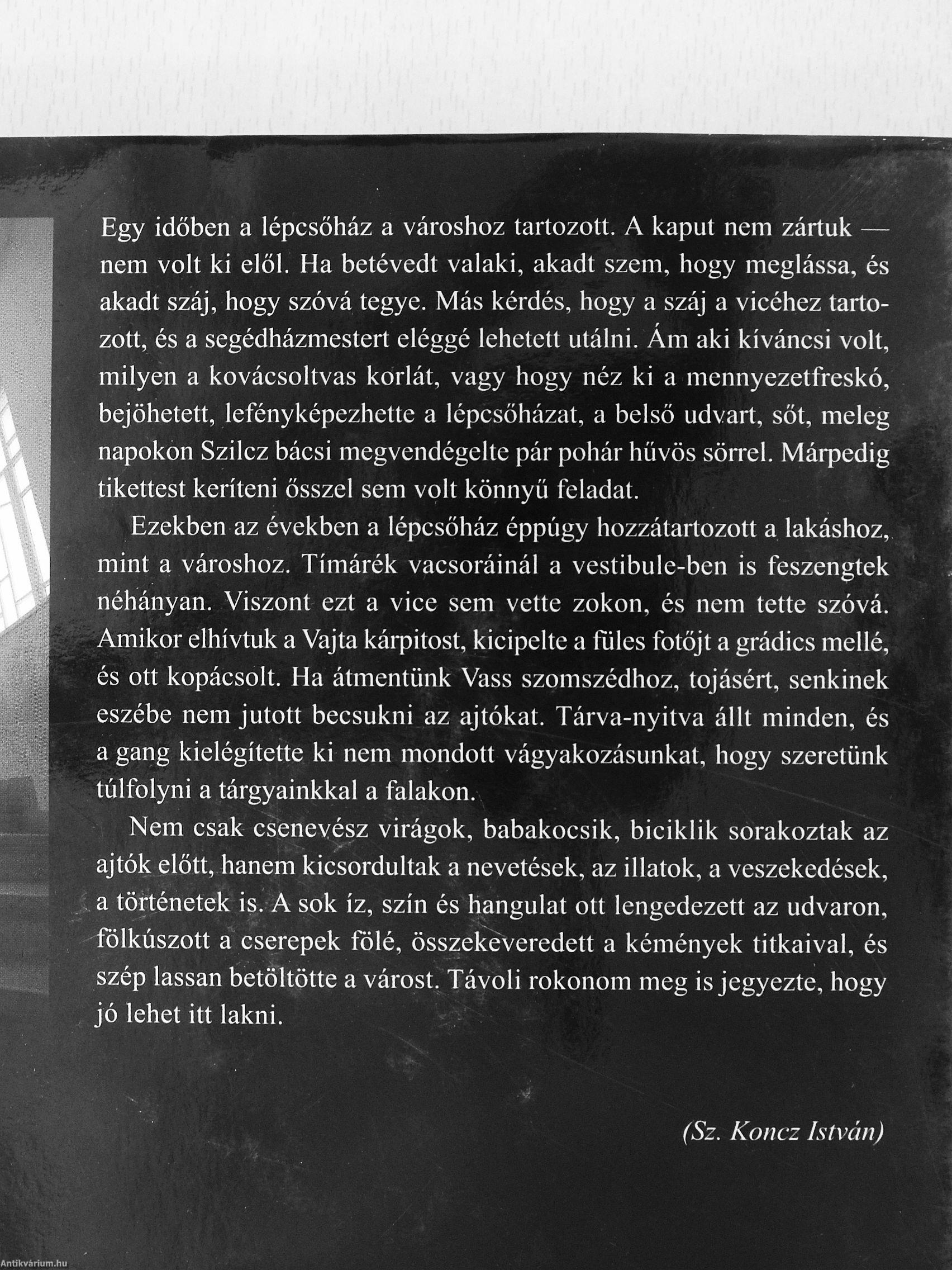 Egy időben a lépcsőház a városhoz tartozott. A kaput nem zártuk — nem volt ki elől. Ha betévedt valaki, akadt szem, hogy meglássa, és akadt száj, hogy szóvá tegye. Más kérdés, hogy a száj a vicéhez tartozott, és a segédházmestert eléggé lehetett utálni. Ám aki kíváncsi volt, milyen a kovácsoltvas korlát, vagy hogy néz ki a mennyezetfreskó, bejöhetett, lefényképezhette a lépcsőházat, a belső udvart, sőt, meleg napokon Szilcz bácsi megvendégelte pár pohár hűvös sörrel. Márpedig tikettest keríteni ősszel sem volt könnyű feladat.