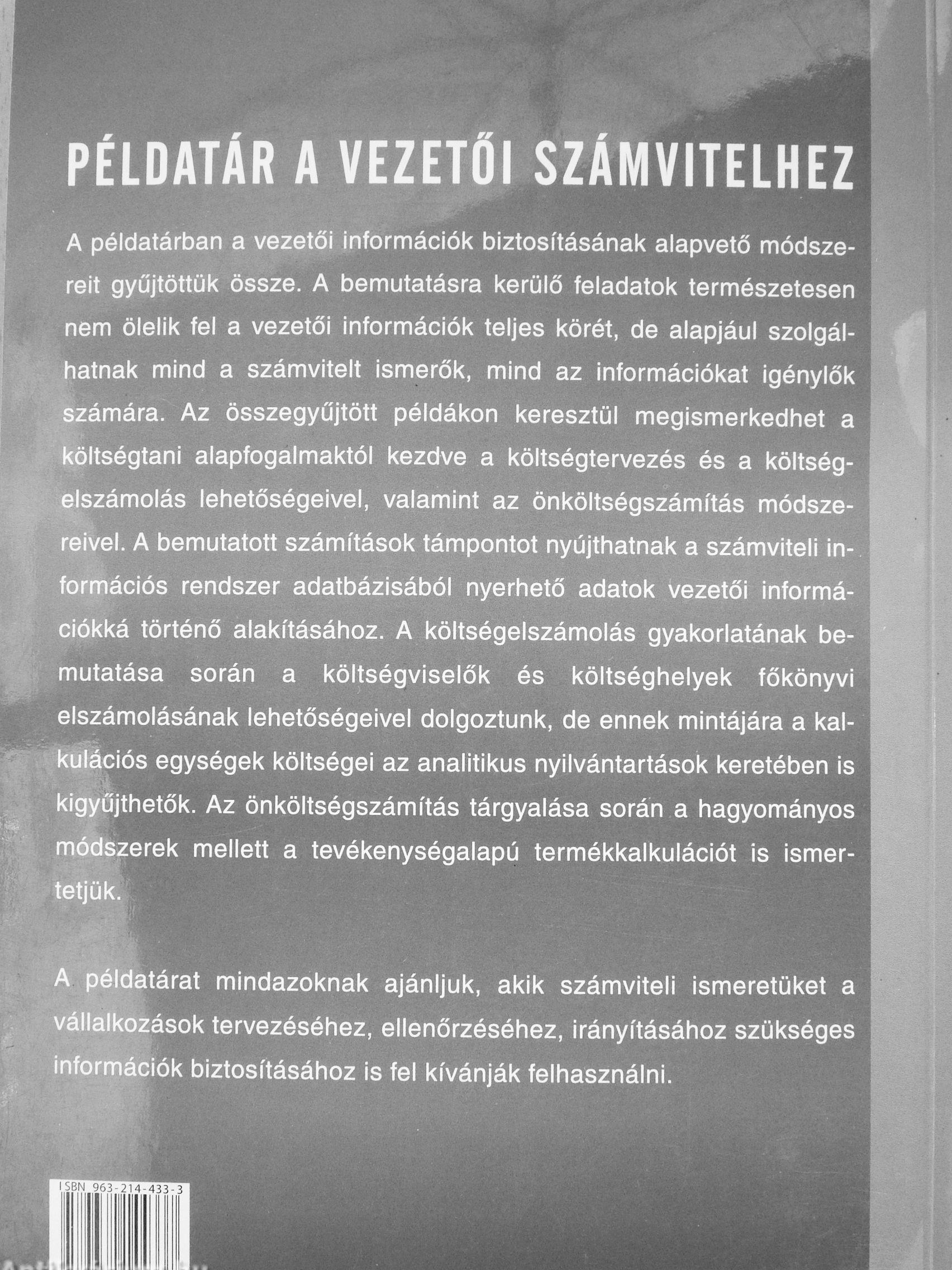 A példatárban a vezetői információk biztosításának alapvető módszereit gyűjtöttük össze. A bemutatásra kerülő feladatok természetesen nem ölelik fel a vezetői információk teljes körét, de alapjául szolgálhatnak mind a számvitelt ismerők, mind az információkat igénylők számára. Az összegyűjtött példákon keresztül megismerkedhet a költségtani alapfogalmaktól kezdve a költségtervezés és a költségelszámolás lehetőségeivel, valamint az önköltségszámítás módszereivel. A bemutatott számítások támpontot nyújthatnak a számviteli információs rendszer adatbázisából nyerhető adatok vezetői információkká történő alakításához. A költségelszámolás gyakorlatának bemutatása során a költségviselők és költséghelyek főkönyvi elszámolásának lehetőségeivel dolgoztunk, de ennek mintájára a kalkulációs egységek költségei az analitikus nyilvántartások keretében is kigyűjthetők. Az önköltségszámítás tárgyalása során a hagyományos módszerek mellett a tevékenységalapú termékkalkulációt is ismertetjük.