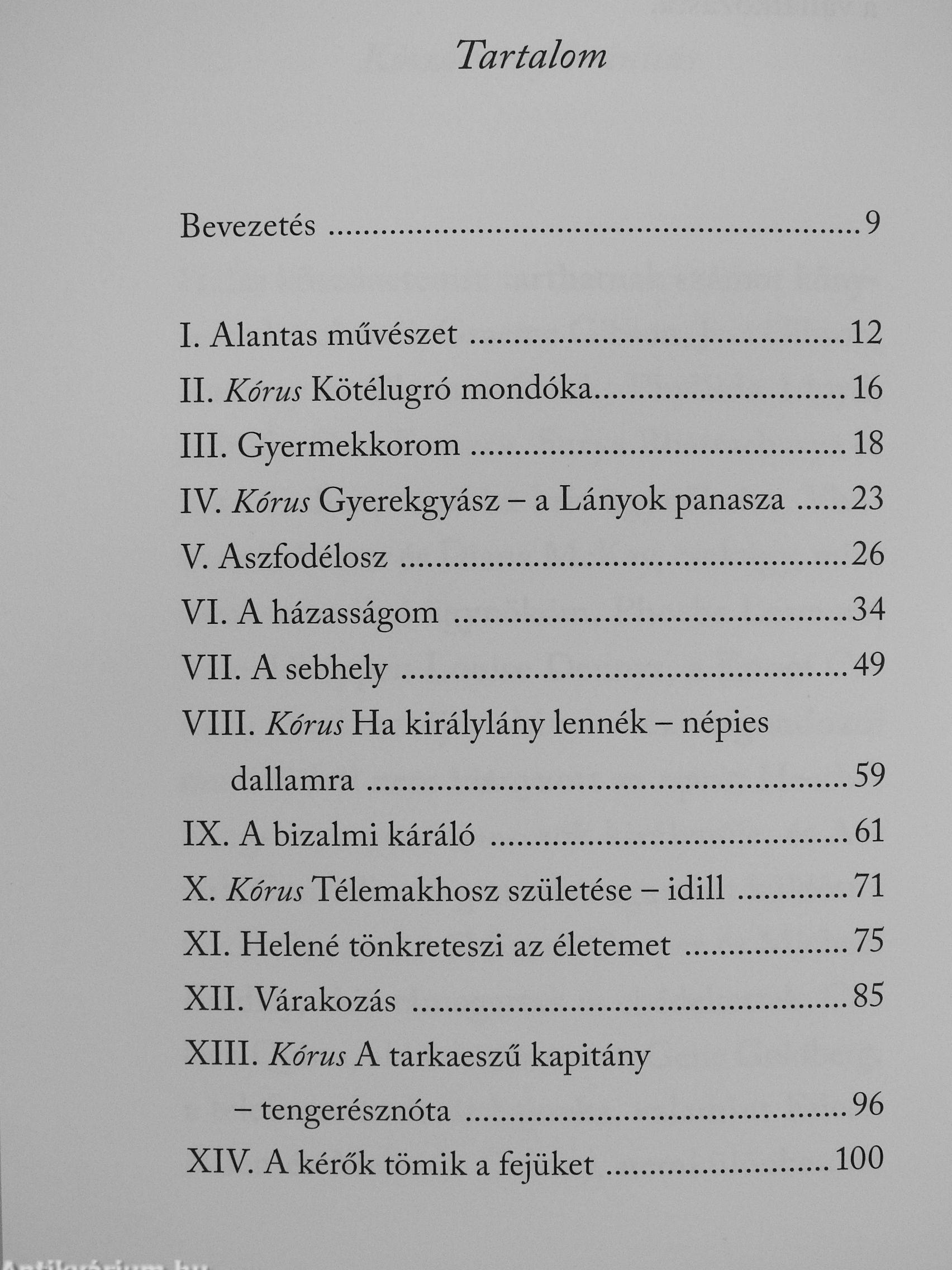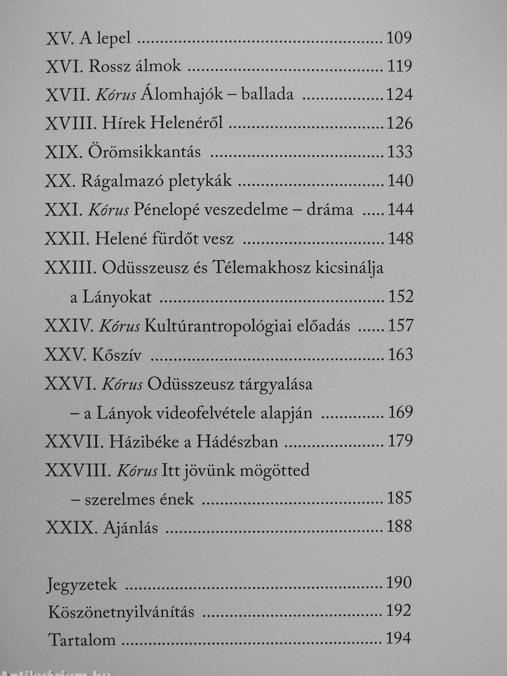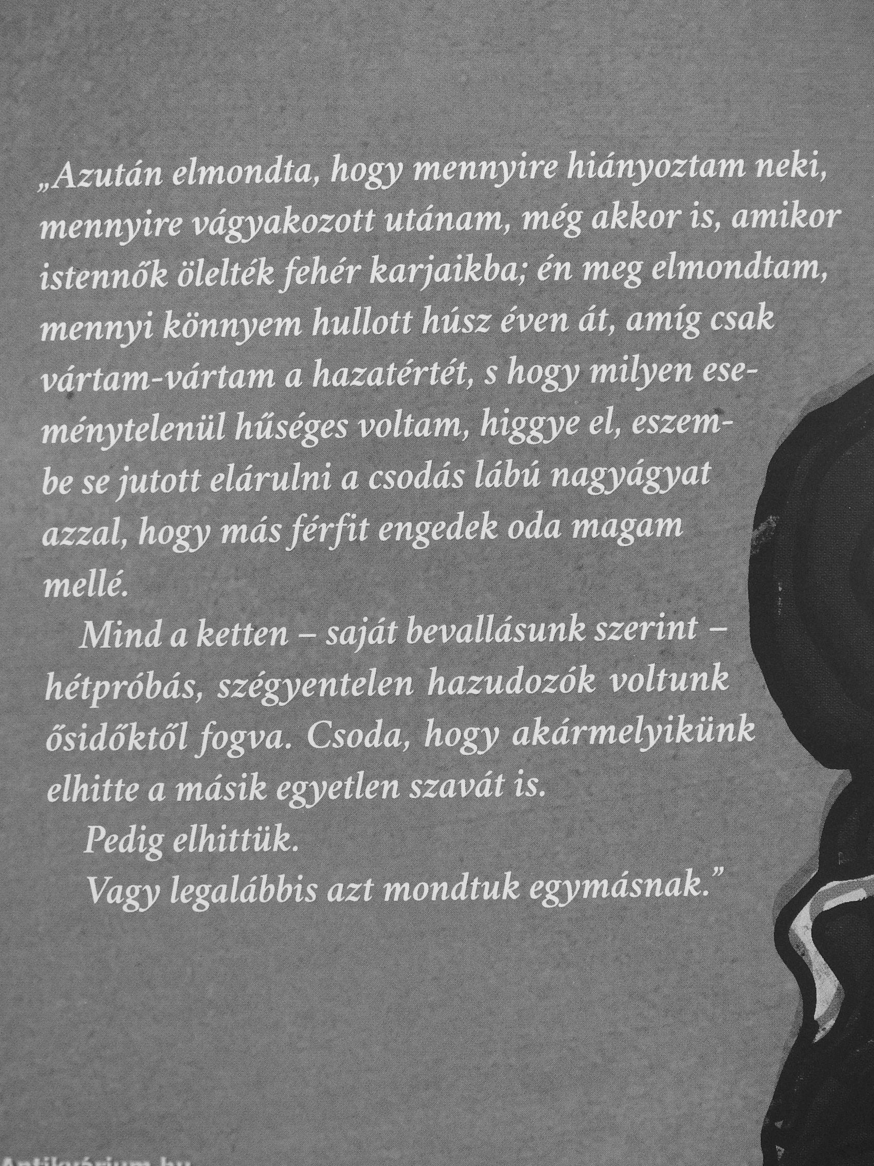 „Azután elmondta, hogy mennyire hiányoztam neki, mennyire vágyakozott utánam, még akkor is, amikor istennők ölelték fehér karjaikba; én meg elmondtam, mennyi könnyem hullott húsz éven át, amíg csak vártam-vártam a hazatértét, s hogy milyen eseménytelenül hűséges voltam, higgye el, eszem- ^ be se jutott elárulni a csodás lábú nagy ágyat azzal, hogy más férfit engedek oda magam mellé.
