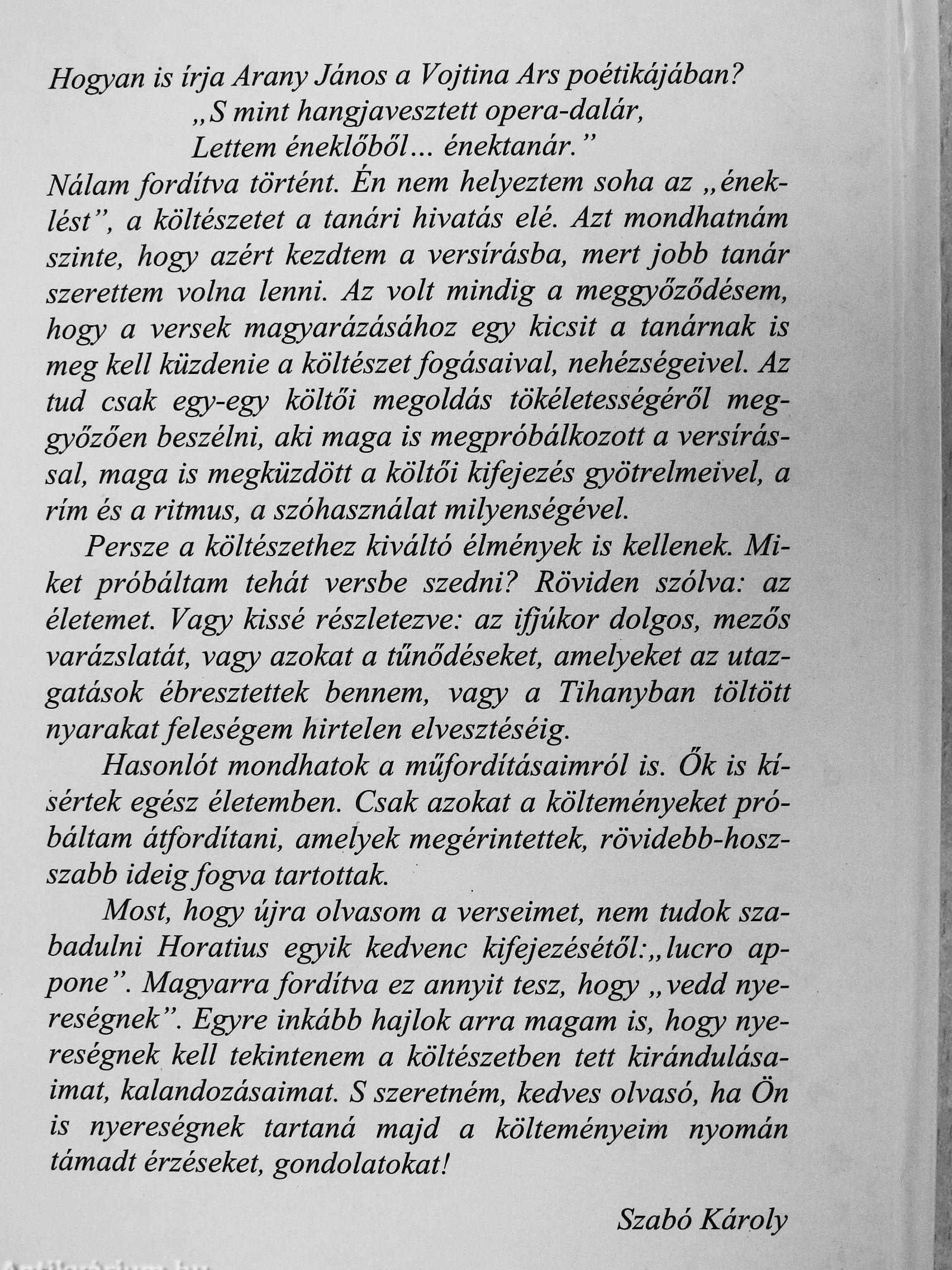 Most, hogy újra olvasom a verseimet, nem tudok szabadulni Horatius egyik kedvenc kifejezésétől:„lucro ap-pone ". Magyarra fordítva ez annyit tesz, hogy „ vedd nyereségnek". Egyre inkább hajlok arra magam is, hogy nyereségnek kell tekintenem a költészetben tett kirándulásaimat, kalandozásaimat. S szeretném, kedves olvasó, ha Ön is nyereségnek tartaná majd a költeményeim nyomán támadt érzéseket, gondolatokat!
