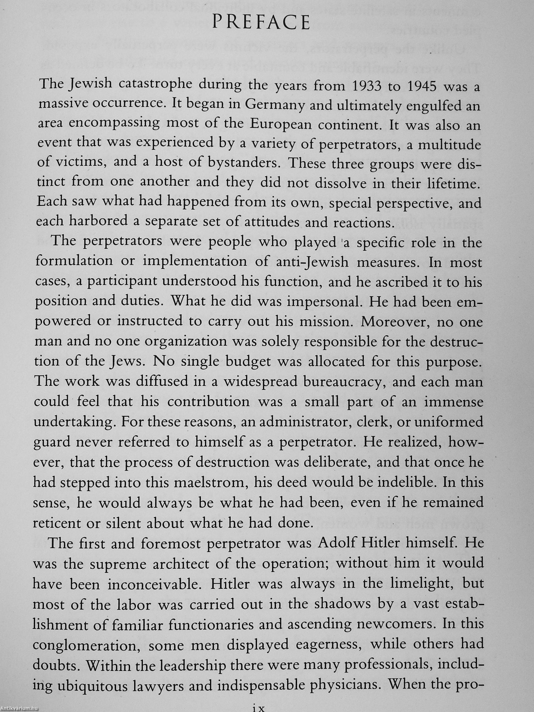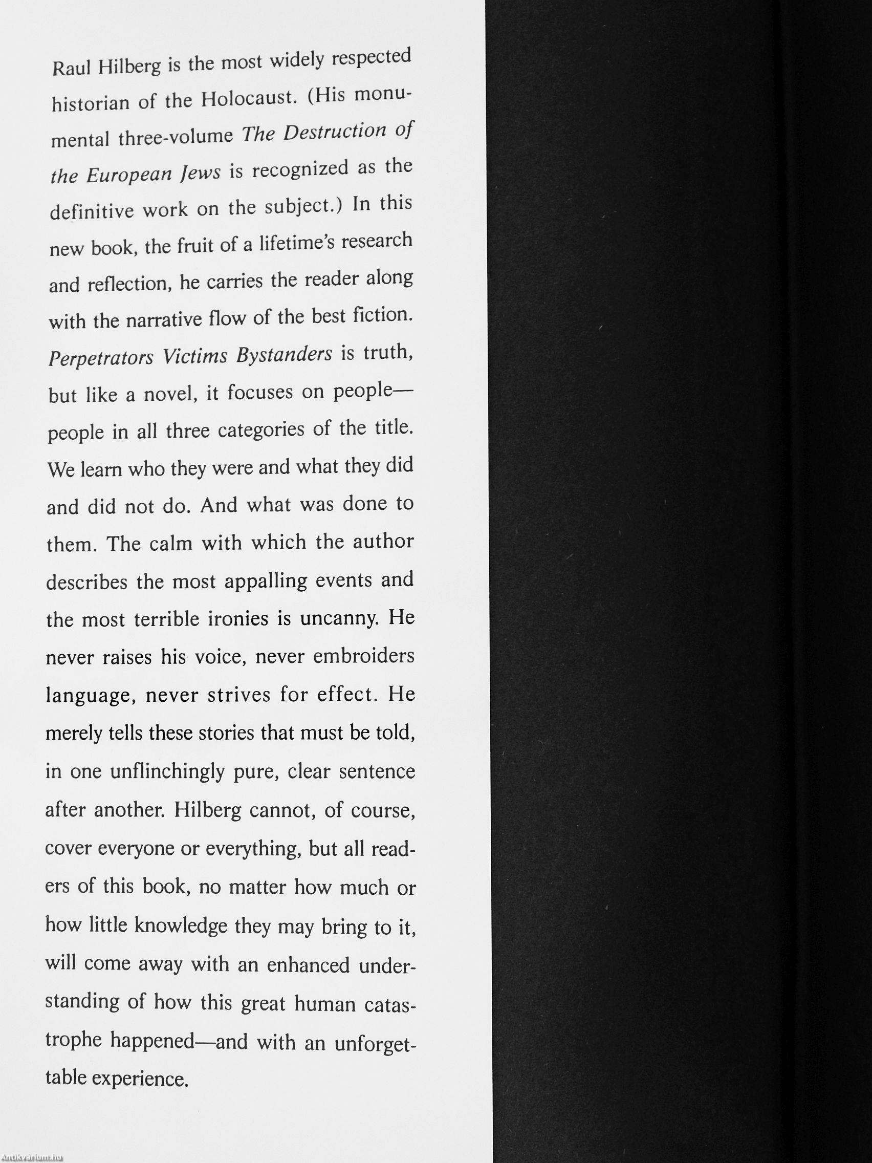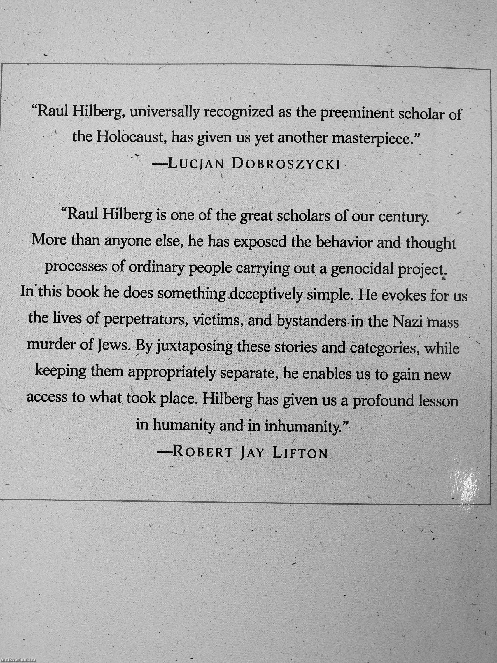 "Raul Hilberg is one of the great scholars of our century. More than anyone else, he has exposed the behavior and thought processes of ordinary people carrying out a genocidal project. In" this book he does something .deceptively simple. He evokes for us the lives of perpetrators, victims, and bystanders in the Nazi tnass murder of Jews. By juxtaposing these stories and categories, while keeping them appropriately separate, he enables us to gain new access to what took place. Hilberg has given us a profound lesson in humanity and in inhumanity" —Robert Jay Lifton