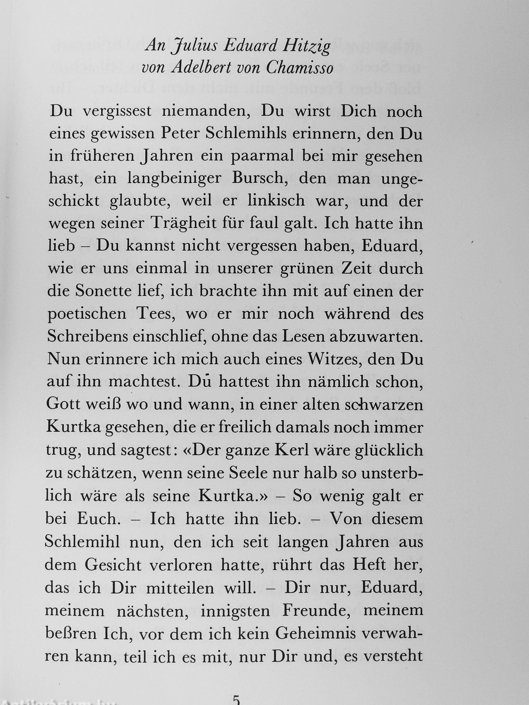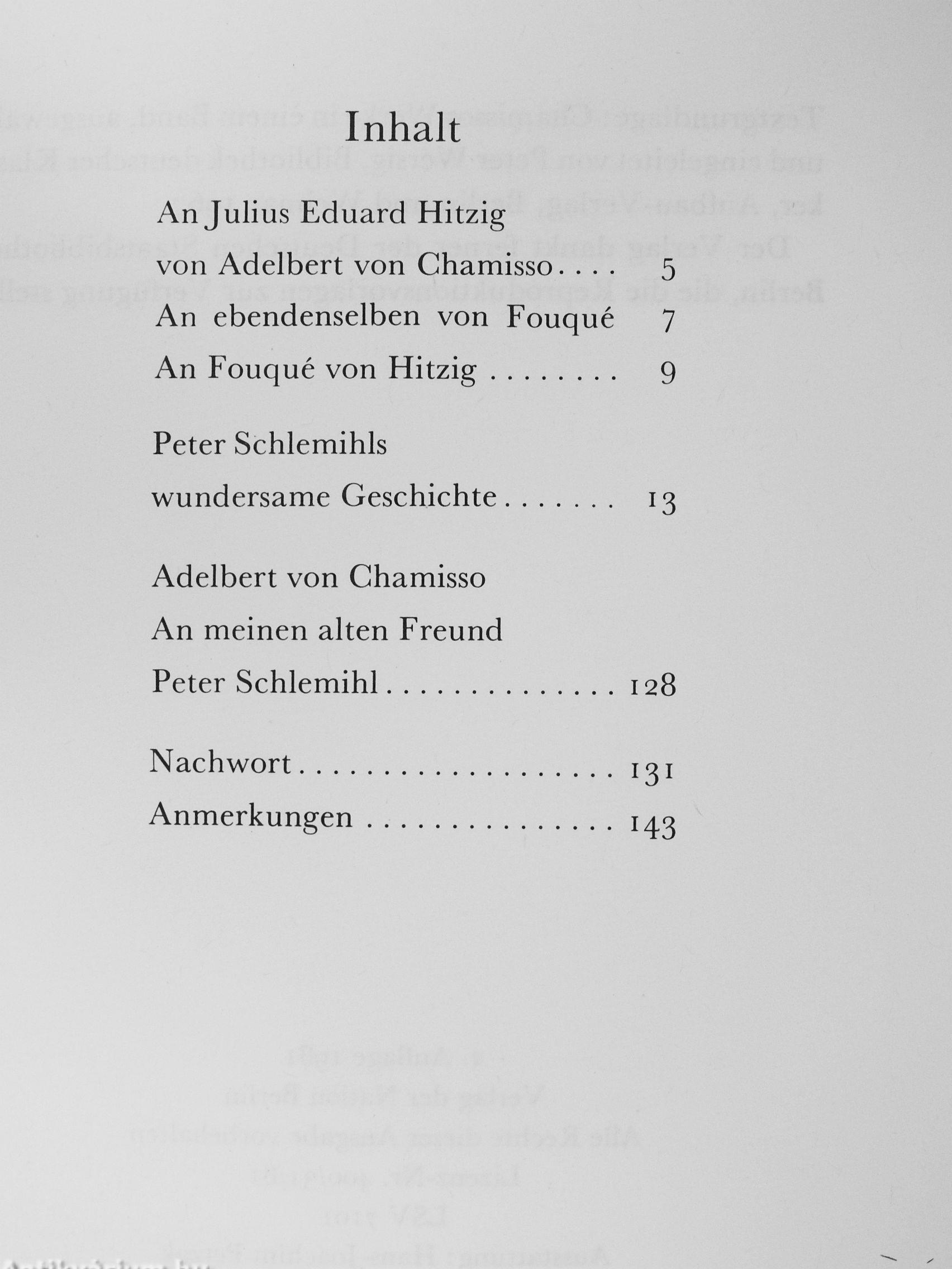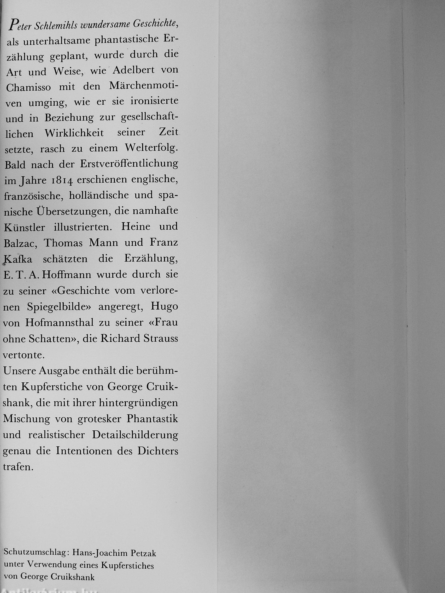 Peter Schlemihls wundersame Geschichte, als unterhaltsame phantastische Erzählung geplant, wurde durch die Art und Weise, wie Adelbert von Chamisso mit den Märchenmotiven umging, wie er sie ironisierte und in Beziehung zur gesellschaftlichen Wirklichkeit seiner Zeit setzte, rasch zu einem Welterfolg. Bald nach der Erstveröffentlichung im Jahre 1814 erschienen englische, französische, holländische und spanische Übersetzungen, die namhafte Künstler illustrierten. Heine und Balzac, Thomas Mann und Franz JCafka schätzten die Erzählung, E. T. A. HofTmann wurde durch sie zu seiner «Geschichte vom verlorenen Spiegelbilde» angeregt, Hugo von Hofmannsthal zu seiner «Frau ohne Schatten», die Richard Strauss vertonte.
