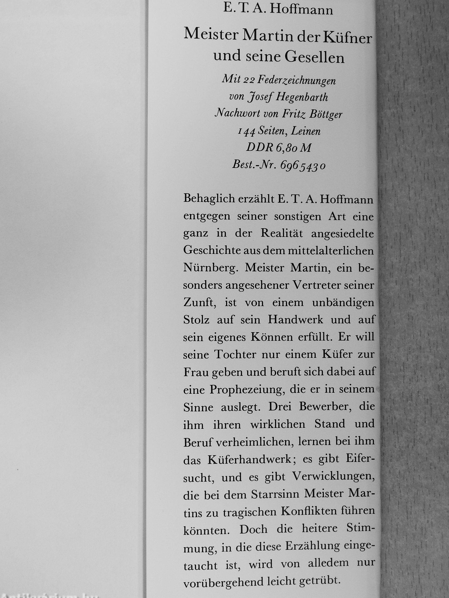 Behaglich erzählt E. T. A. HofFmann entgegen seiner sonstigen Art eine ganz in der Realität angesiedelte Geschichte aus dem mittelalterlichen Nürnberg. Meister Martin, ein besonders angesehener Vertreter seiner Zunft, ist von einem unbändigen Stolz auf sein Handwerk und auf sein eigenes Können erfüllt. Er will seine Tochter nur einem Küfer zur Frau geben und beruft sich dabei auf eine Prophezeiung, die er in seinem Sinne auslegt. Drei Bewerber, die ihm ihren wirklichen Stand und Beruf verheimlichen, lernen bei ihm das Küferhandwerk; es gibt Eifersucht, und es gibt Verwicklungen, die bei dem Starrsinn Meister Martins zu tragischen Konflikten führen könnten. Doch die heitere Stimmung, in die diese Erzählung eingetaucht ist, wird von alledem nur vorübergehend leicht getrübt.