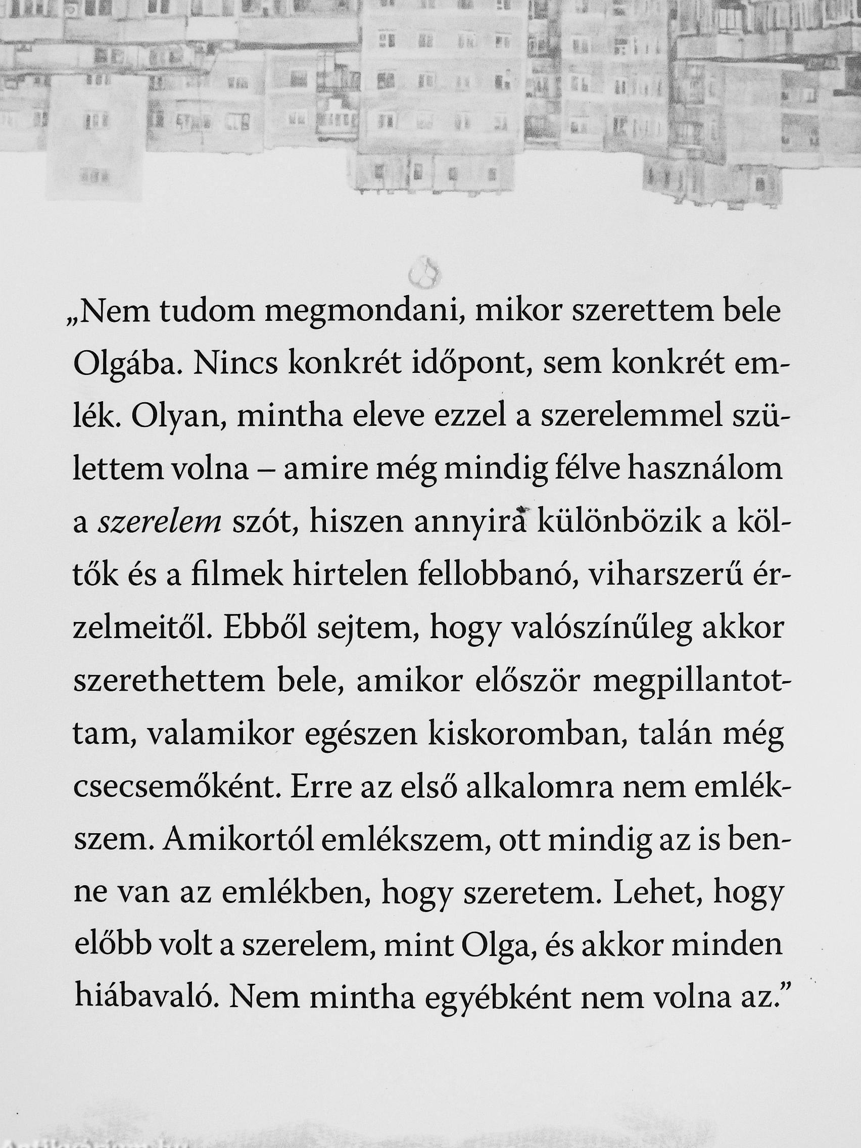 „Nem tudom megmondani, mikor szerettem bele Olgába. Nincs konkrét időpont, sem konkrét emlék. Olyan, mintha eleve ezzel a szerelemmel születtem volna - amire még mindig félve használom a szerelem szót, hiszen annyira különbözik a költők és a filmek hirtelen fellobbanó, viharszerű érzelmeitől Ebből sejtem, hogy valószínűleg akkor szerethettem bele, amikor először megpillantottam, valamikor egészen kiskoromban, talán még csecsemőként. Erre az első alkalomra nem emlékszem. Amikortól emlékszem, ott mindig az is benne van az emlékben, hogy szeretem. Lehet, hogy előbb volt a szerelem, mint Olga, és akkor minden hiábavaló. Nem mintha egyébként nem volna az."