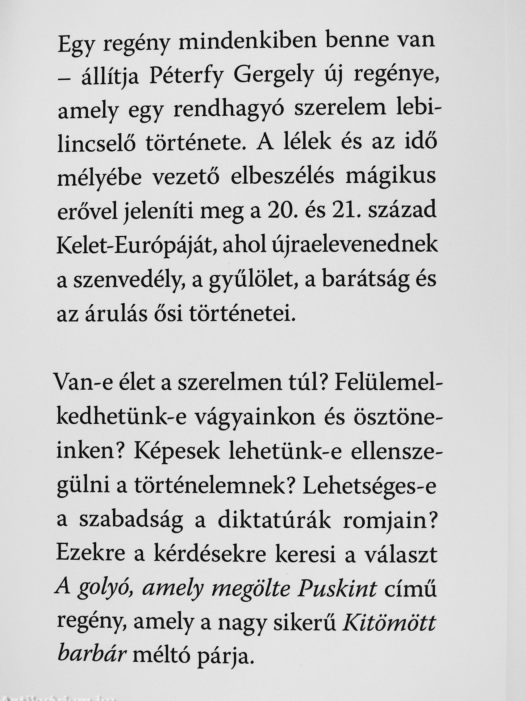 Van-e élet a szerelmen túl? Felülemel-kedhetünk-e vágyainkon és ösztöneinken? Képesek lehetünk-e ellenszegülni a történelemnek? Lehetséges-e a szabadság a diktatúrák romjain? Ezekre a kérdésekre keresi a választ A golyó, amely megölte Puskint című regény, amely a nagy sikerű Kitömött barbár méltó párja.