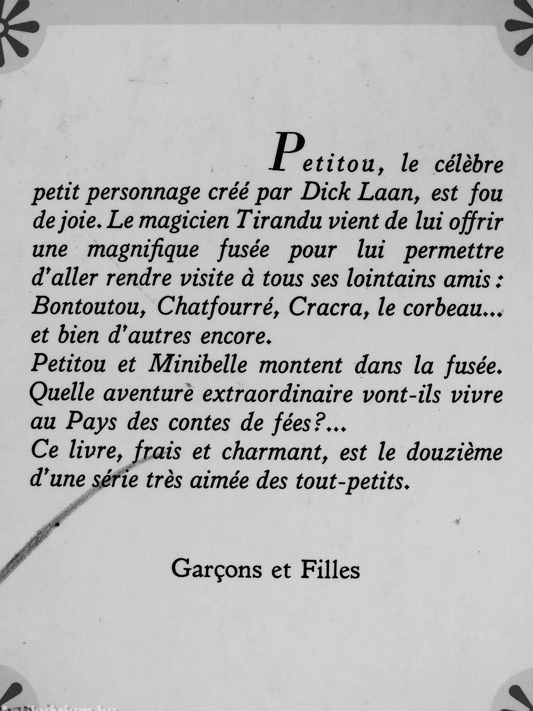 Pet itou, le célebre petit personnage créé par Dick Laan, est fou de joie. Le magicien Tirandu vient de lui offrir une magnifique fusée pour lui permettre d*aller rendre visite a tous ses lointains amis : Bontoutou, Chatfourré, Cracra, le corbeau et bien d*autres encore. Petitou et Minibelle montent dans la fusée. Quelle aventure extraordinaire vont-ils vivre au Pays des contes de fées? Ce livre, frais et charmant, est le douzieme d*une série tres aimée des tout-petits.