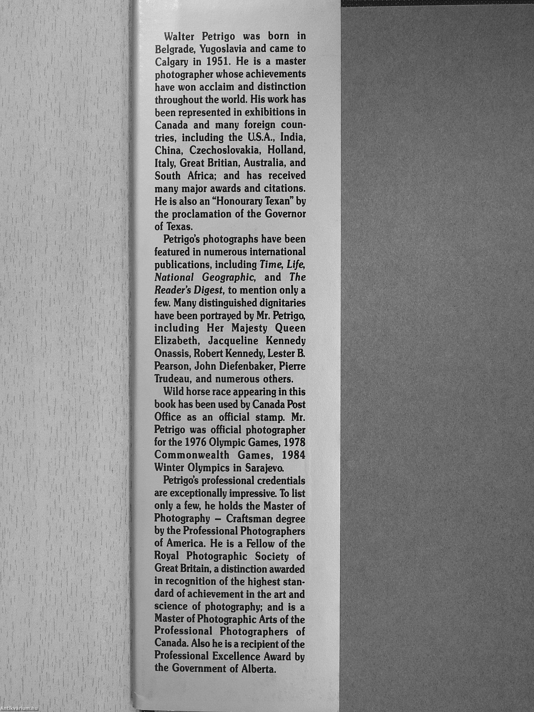 Wild horse race appearing in this book has been used by Canada Post Office as an official stamp. Mr. Petrigo was official photographer for the 1976 Olympic Games, 1978 Commonwealth Games, 1984 Winter Olympics in Sarajeva
