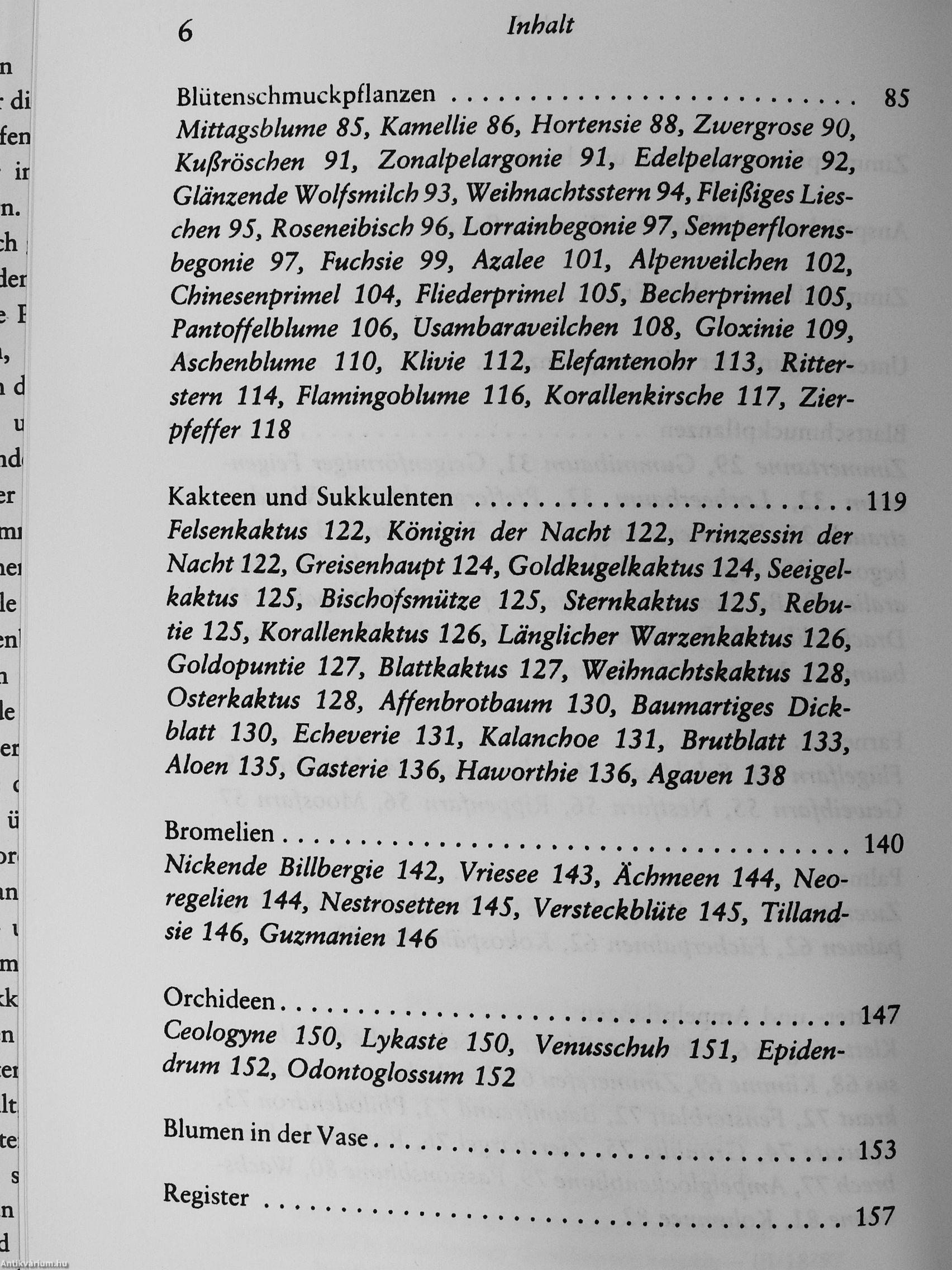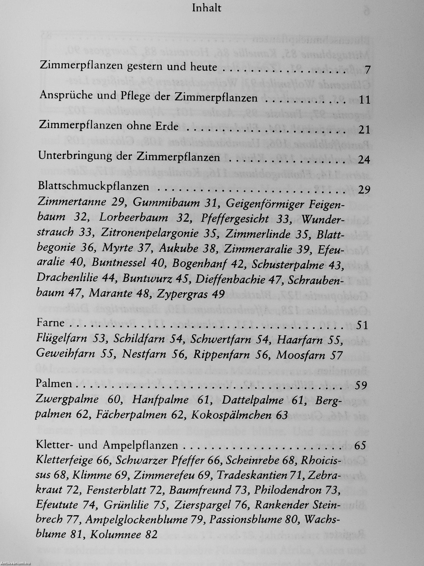 Den Pflanzenfreunden widmen wir dieses Buch und wollen ihnen helfen, noch erfolgreicher als bisher in ihrer Wohnung zu gärtnern. Aber auch diejenigen, die noch gar keine Erfahrung haben, finden Rat und Hilfe, damit sie ihre Pflanzen richtig pflegen lernen, dazu manche Anregung, sich doch einmal einer ihnen bisher unbekannten Pflanze zuzuwenden. Es müssen ja nicht in jeder Wohnung nur Monstera, Gummibaum und Sansevierie stehen!
