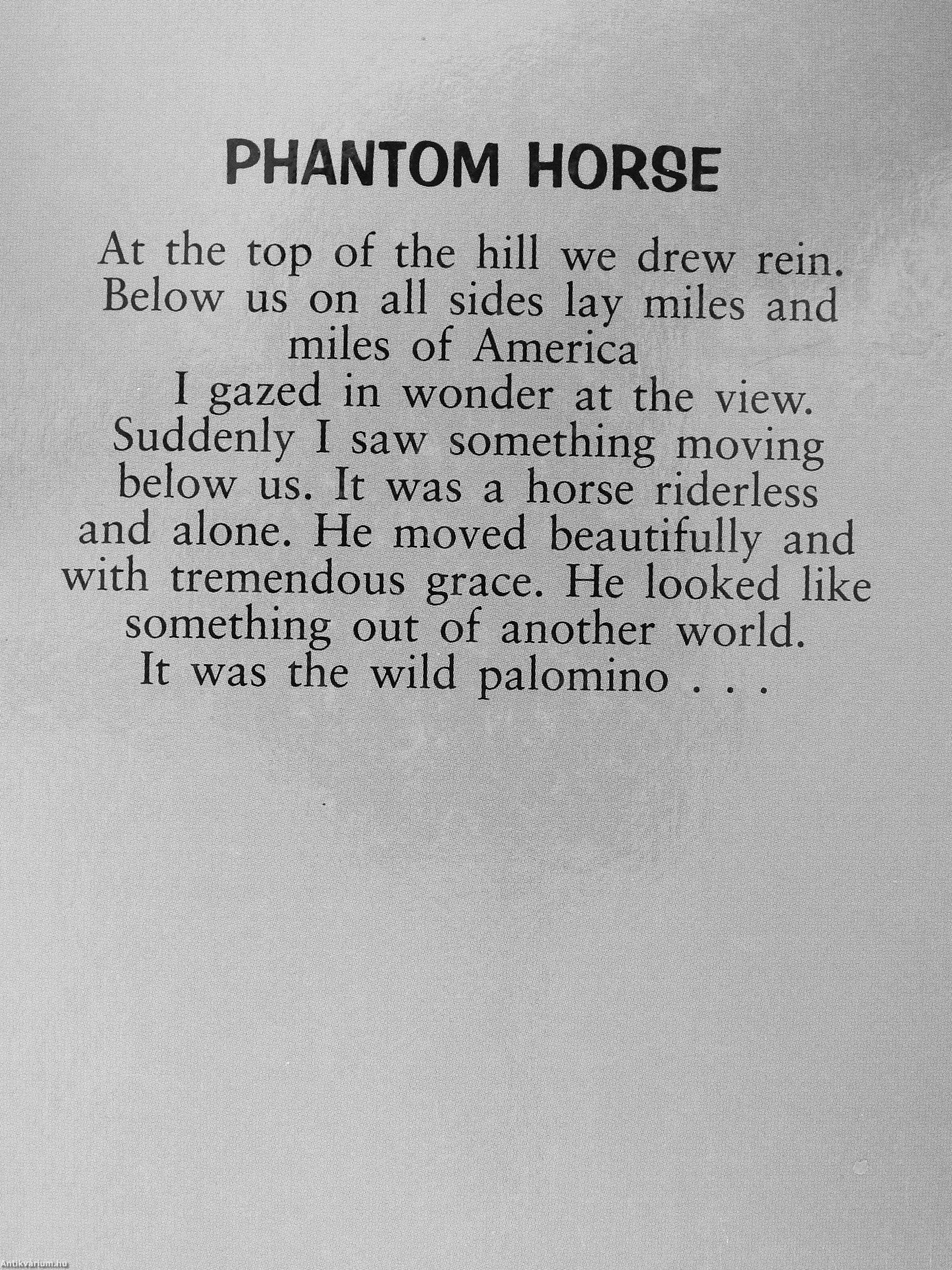 At the top of the hill we drew rein. Below us on all sides lay miles and miles of America I gazed in wonder at the view. Suddenly I saw something moving below us. It was a horse riderless and alone. He moved beautifully and with tremendous grace. He looked like something out of Mother world. It was the wild palomino . . .