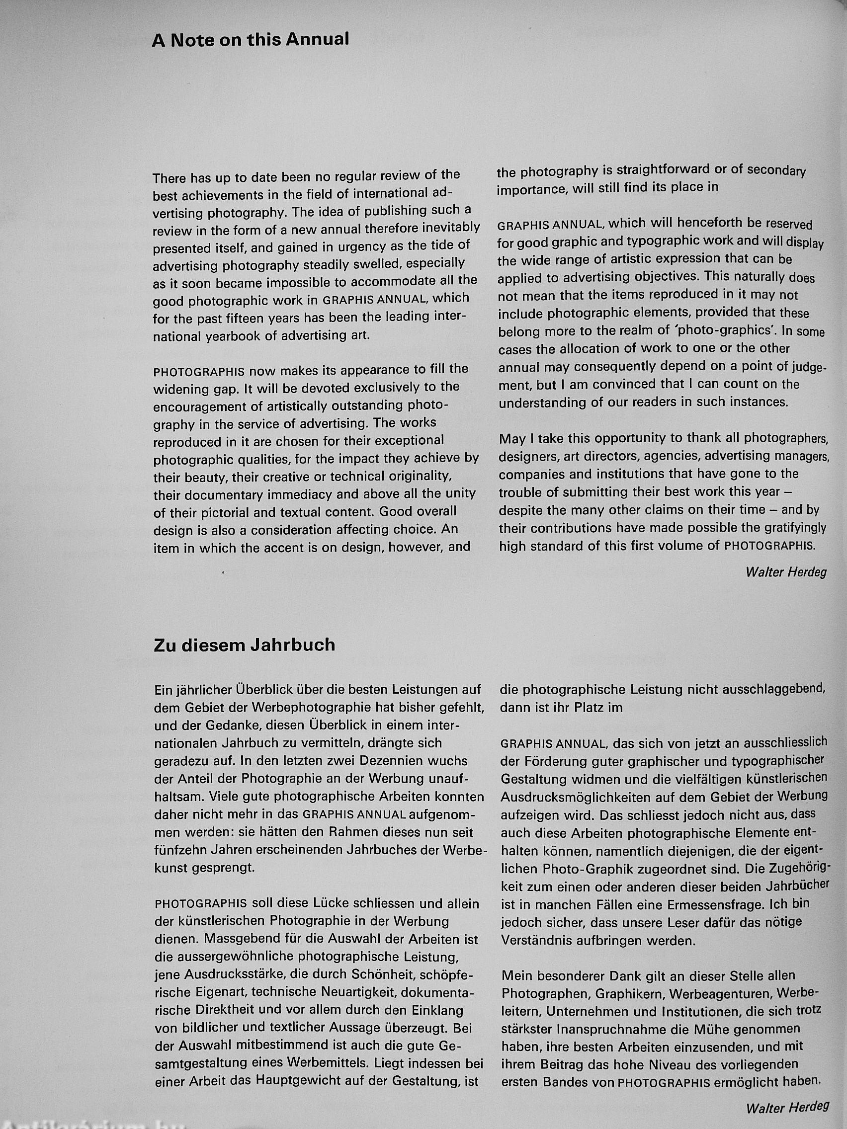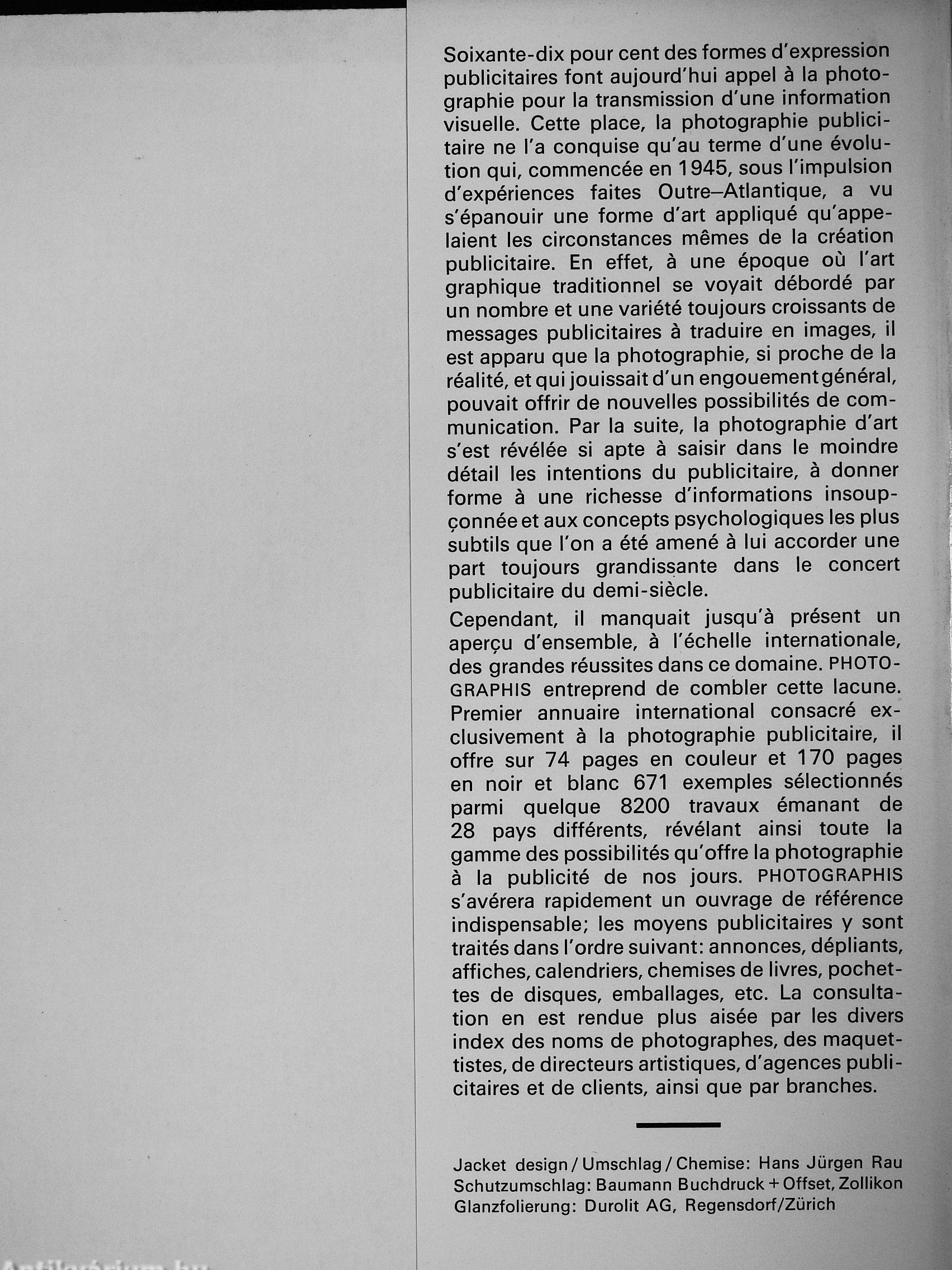 Ein internationaler Überblick über die hervorragendsten Leistungen auf diesem Gebiet hat bisher gefehlt. PHOTOGRAPHIS schliesst diese Lücke: es ist das erste internationale Jahrbuch, das ausschliesslich der Werbephotographie gewidmet ist. 671 Beispiele, ausgewählt aus 8200 Arbeiten aus 28 Ländern, wiedergegeben auf 74 Färb- und 170 Schwarzweiss-Seiten, zeigen die ganze Skala der Möglichkeiten der Photographie in der heutigen Werbung. PHOTOGRAPHIS ist ein unentbehrliches Nachschlagewerk, geordnet nach Werbemitteln -Inserat, Prospekt, Plakat, Kalender, Buch- und Schallplattenhülle, Packung etc. - versehen mit einem Index nach Photographen, Gestaltern, Art Directors, Werbeagenturen, Auftraggebern und Branchen.