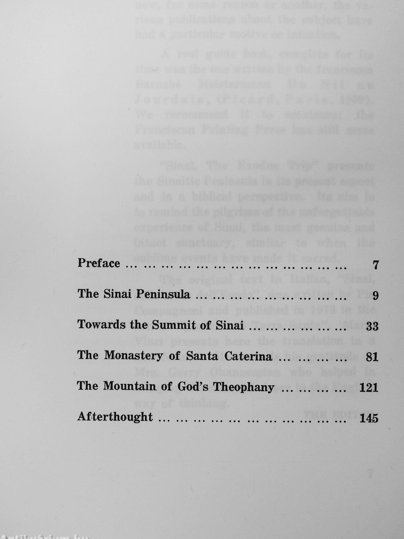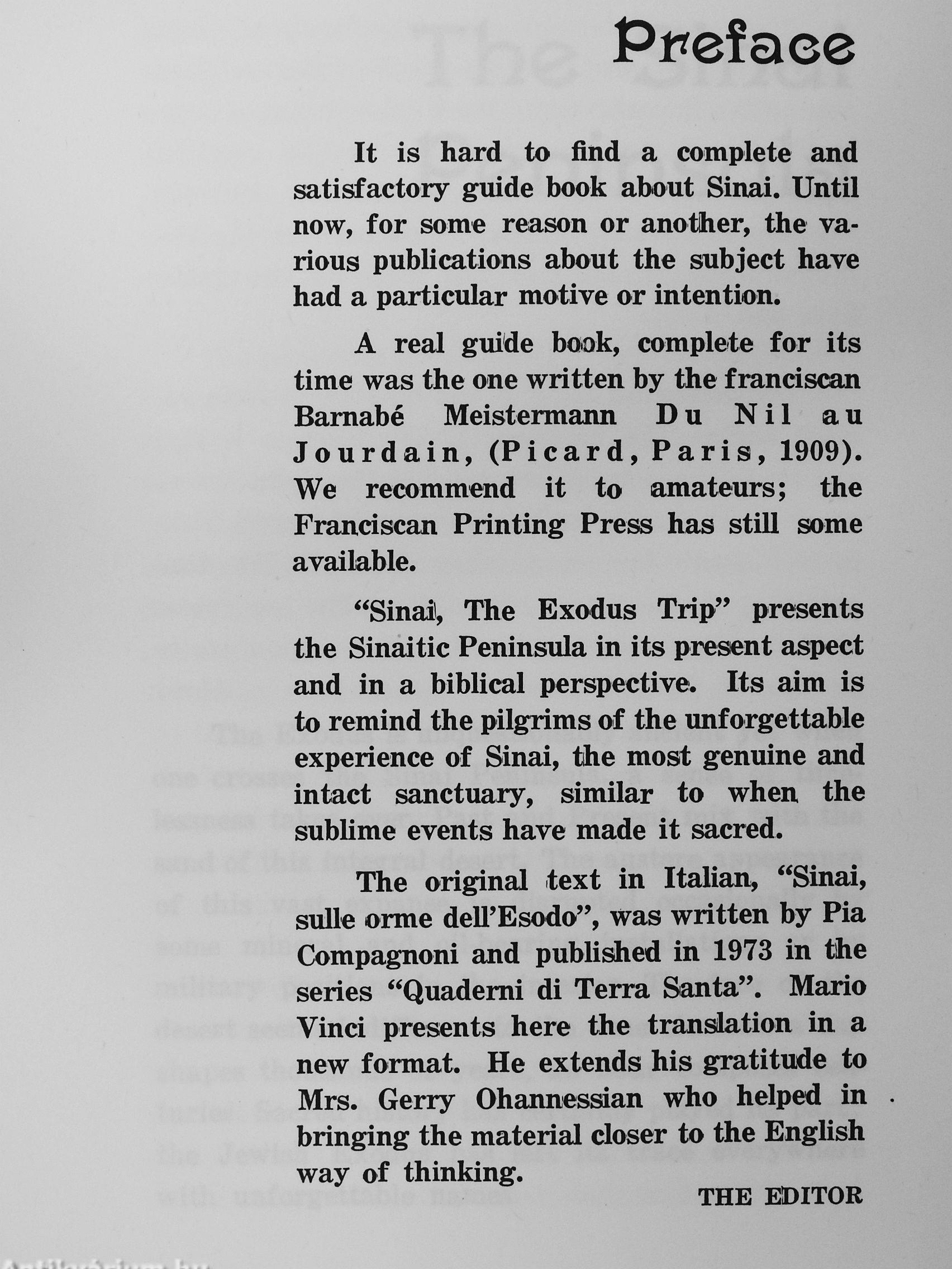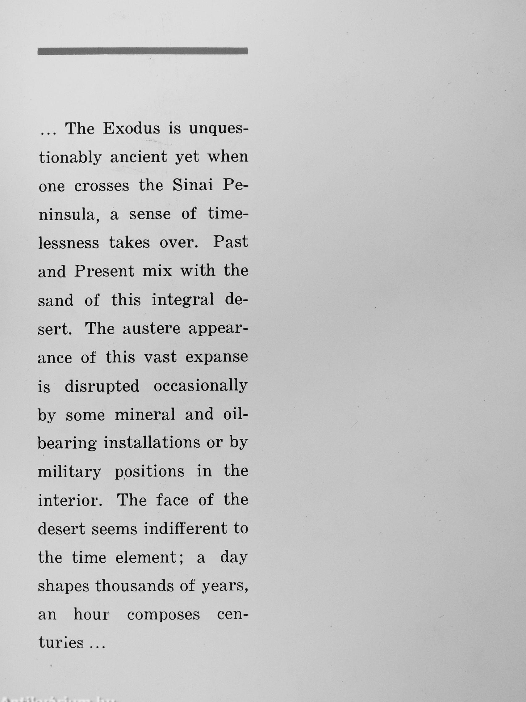 The Exodus is unquestionably ancient yet when one crosses the Sinai Peninsula, a sense of time-lessness takes over. Past and Present mix with the sand of this integral desert. The austere appearance of this vast expanse is disrupted occasionally by some mineral and oil-bearing installations or by military positions in the interior. The face of the desert seems indifferent to the time element; a day shapes thousands of years, an hour composes centuries