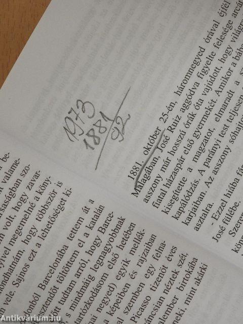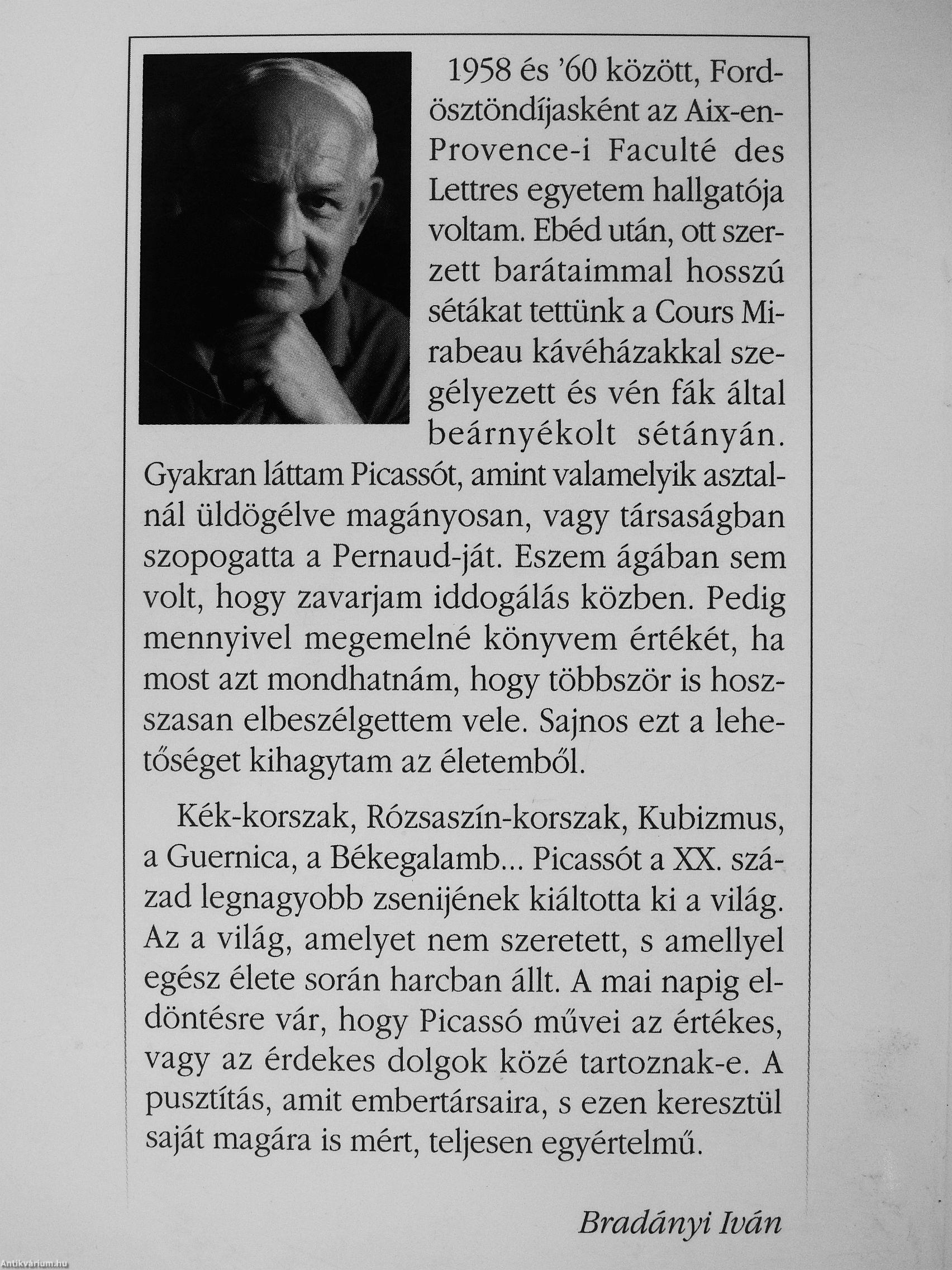 1958 és '60 között, Fordösztöndíjasként az Aix-en-Provence-i Faculté des Lettres egyetem hallgatója voltam. Ebéd után, ott szerzett barátaimmal hosszú sétákat tettünk a Cours Mi-rabeau kávéházakkal szegélyezett és vén fák által beárnyékolt sétányán. Gyakran láttam Picassót, amint valamelyik asztalnál üldögélve magányosan, vagy társaságban szopogatta a Pernaud-ját. Eszem ágában sem volt, hogy zavarjam iddogálás közben. Pedig mennyivel megemelné könyvem értékét, ha most azt mondhatnám, hogy többször is hosz-szasan elbeszélgettem vele. Sajnos ezt a lehetőséget kihagytam az életemből.