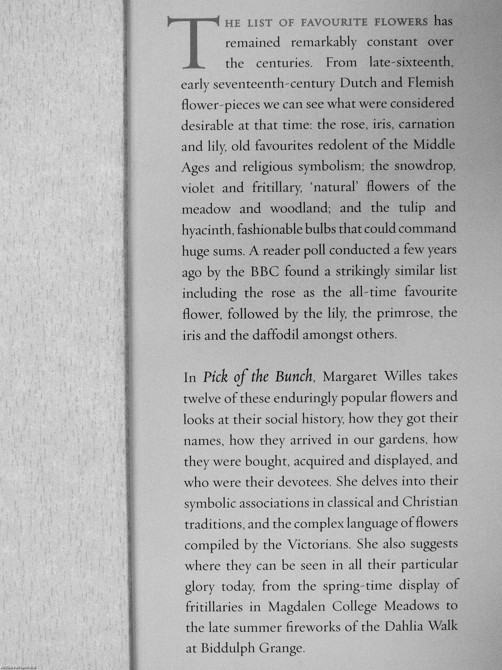 In Pick of the Bunch, Margaret Willes takes twelve of these enduringly popular flowers and looks at their social history, how they got their names, how they arrived in our gardens, how they were bought, acquired and displayed, and who were their devotees. She delves into their symbolic associations in classical and Christian traditions, and the complex language of flowers compiled by the Victorians. She also suggests where they can be seen in all their particular glory today, from the spring-time display of fritillaries in Magdalen College Meadows to the late summer fireworks of the Dahlia Walk at Biddulph Grange.