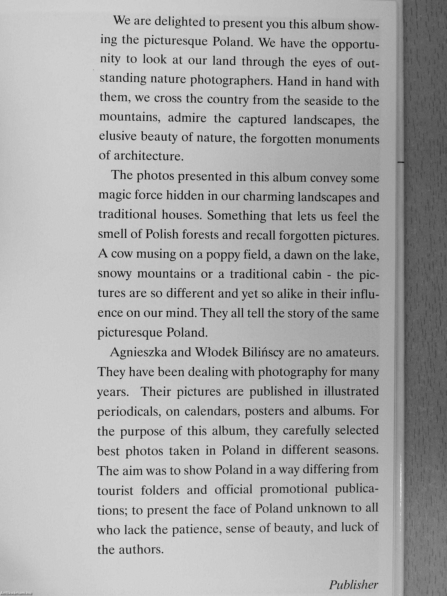 Photography and Image Information Study at the Warsaw University. They are founder members of the Polish Nature Photographers' Union. They have eight photo albums in their catalogue. Their pictures are also published in many national and foreign periodicals, calendars, books, and photo albums. 'Picturesque Poland" shows the Poland they love best: beautiful landscapes, the lovely countryside and picturesque manors and castles.