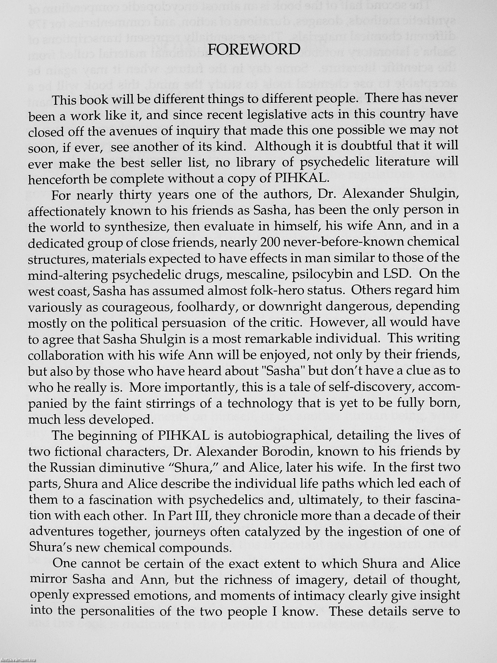 "PIHKAL is a compelling novel. Given the autobiographical natúrt; of the story, the subject matter — psychedelic bioc hemistry and sexual chemistry — is daring indeed. PIHKAL is materially long but experientially short, no doubt due to the brisk and vivid writing."