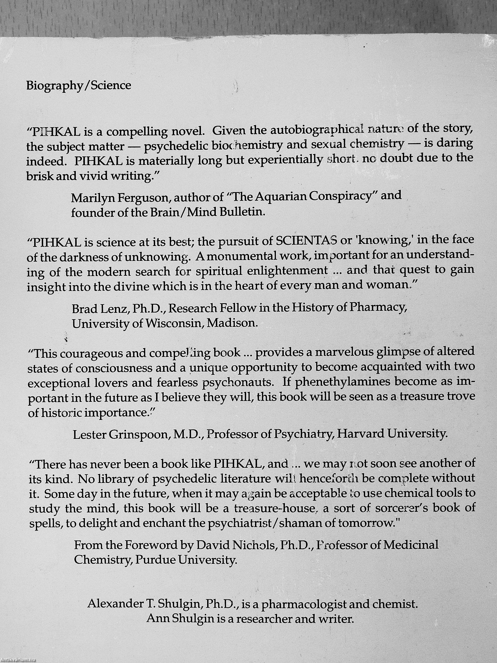 "There has never been a book like PIHKAL, and we may not soon see another of its kind. No library of psychedelic literature wilt henceforth be complete without it. Some day in the future, when it may again be acceptable to use chemical tools to study the mind, this book will be a treasure-house, a sort of sorcerer's book of spells, to delight and enchant the psychiatrist/shaman of tomorrow."