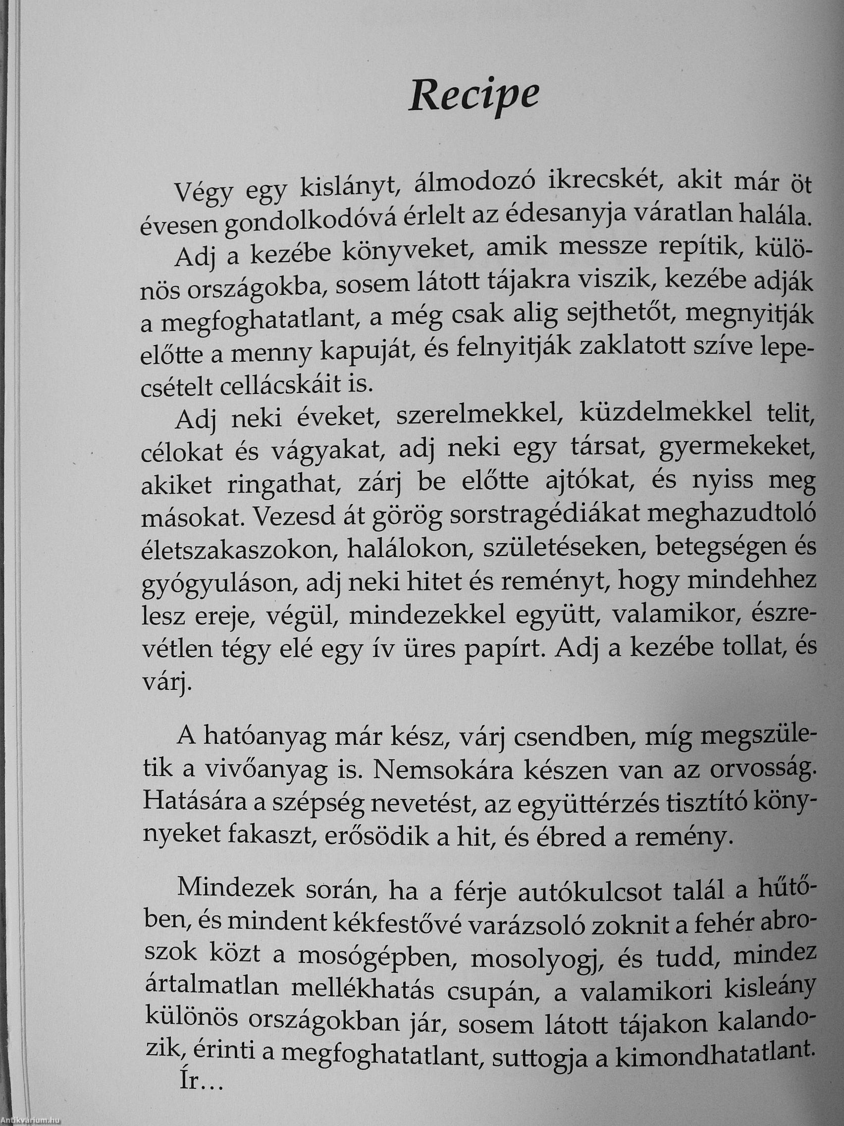 Adj neki éveket, szerelmekkel, küzdelmekkel telit, célokat és vágyakat, adj neki egy társat, gyermekeket, akiket ringathat, zárj he előtte ajtókat, és nyiss meg másokat. Vezesd át görög sorstragédiákat meghazudtoló^ életszakaszokon, halálokon, születéseken, betegségen és gyógyuláson, adj neki hitet és reményt, hogy mindehhez lesz ereje, végül, mindezekkel együtt, valamikor, észrevétlen tégy elé egy ív üres papírt. Adj a kezébe tollat, és várj."