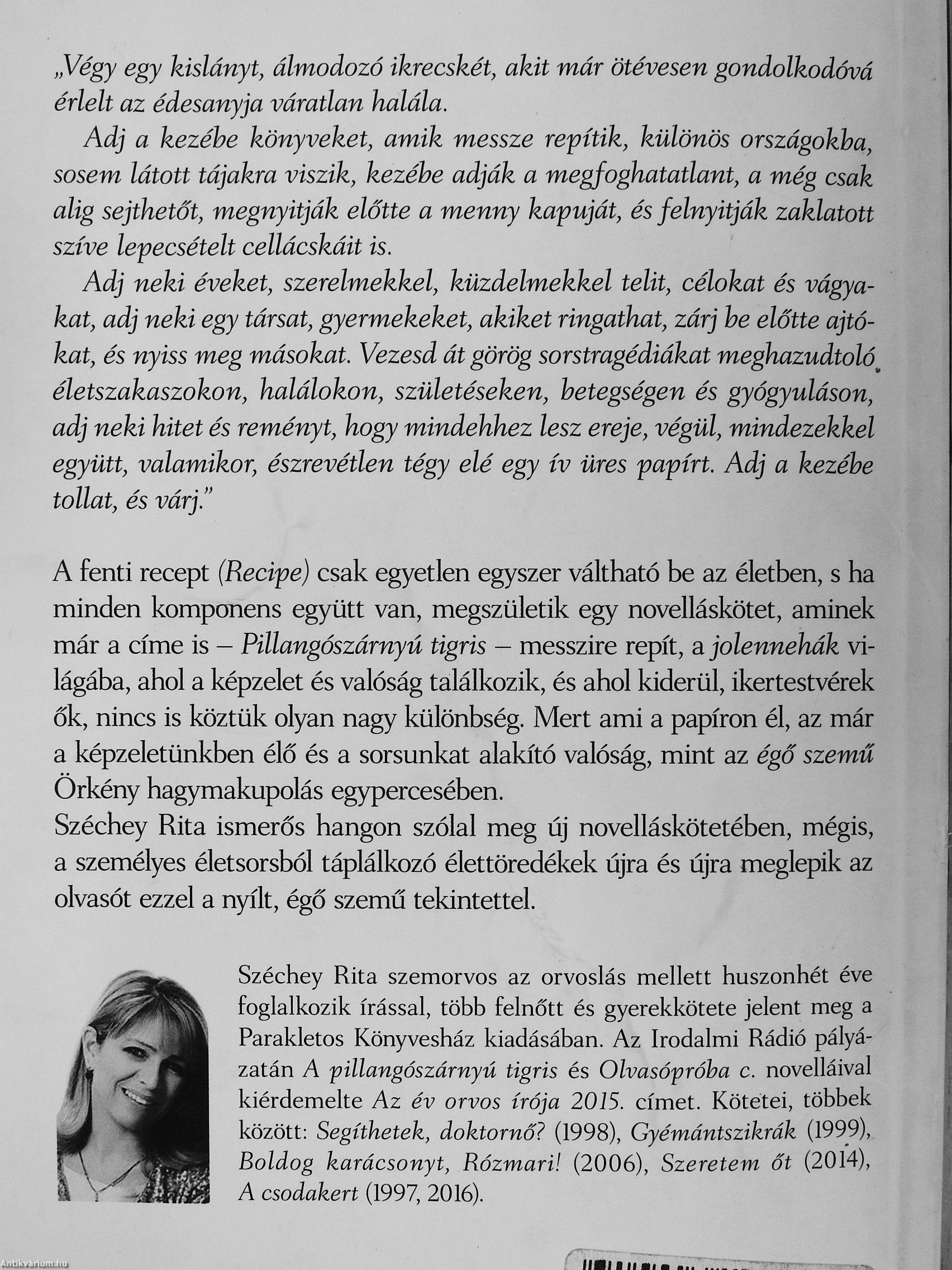 A fenti recept (Recipe) csak egyetlen egyszer váltható be az életben, s ha minden komponens együtt van, megszületik egy novelláskötet, aminek már a címe is - Pillangószárnyú tigris — messzire repít, a jolennehák világába, ahol a képzelet és valóság találkozik, és ahol kiderül, ikertestvérek ők, nincs is köztük olyan nagy különbség. Mert ami a papíron él, az már a képzeletünkben élő és a sorsunkat alakító valóság, mint az égő szemű Örkény hagymakupolás egypercesében.
