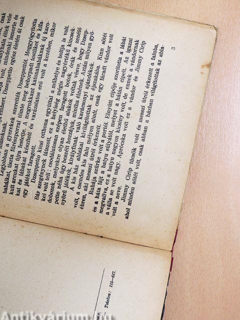 Ruhája szürke volt a portól. Elnyűtt cipője szorította a lábát és a háta fájt a batyu súlyától, melyet a hátán cipelt. Az igazat megvallva, ez a batyu nagyon kicsiny volt, de ennek a vándornak a válla se volt nagy. Aprócska volt ez a vándor és Jimmy Cirip volt a neve.