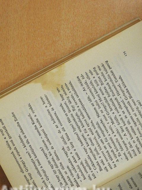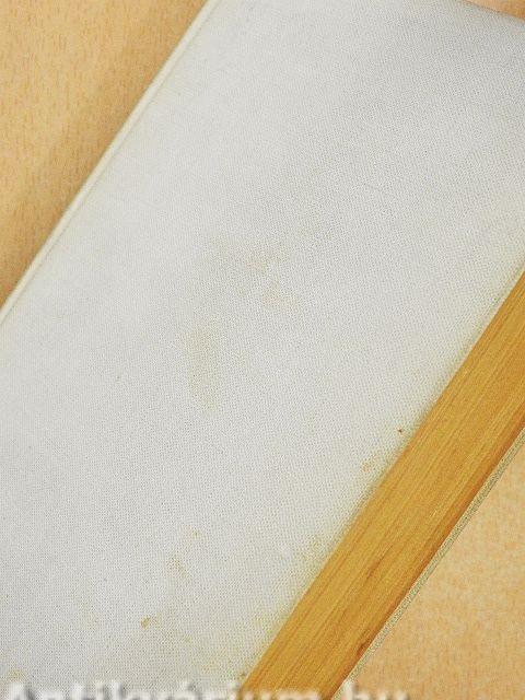 A borító, a lapélek és több lap foltos. Az előzéklapon bejegyzés, az előlapon ajándékozási bejegyzés látható.