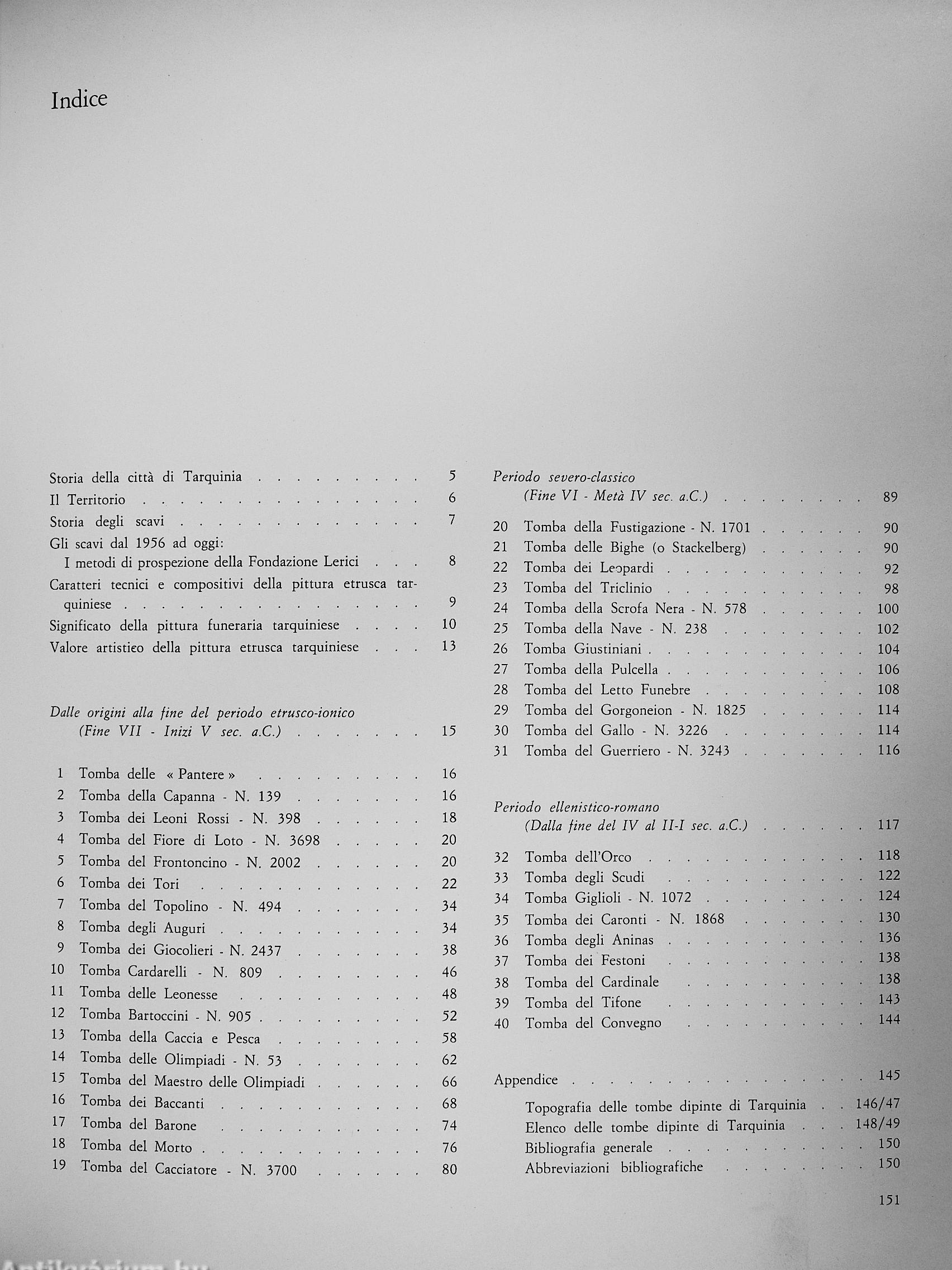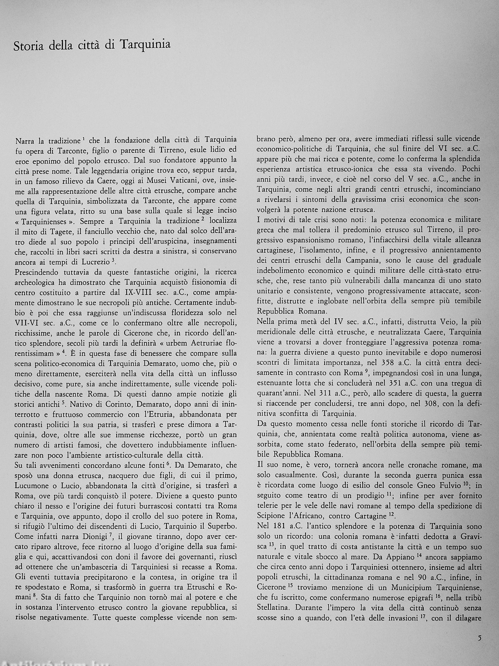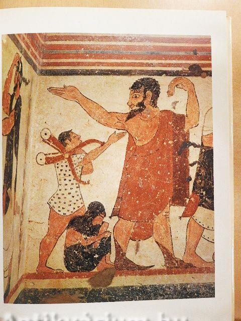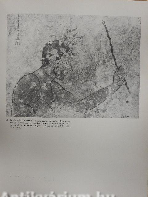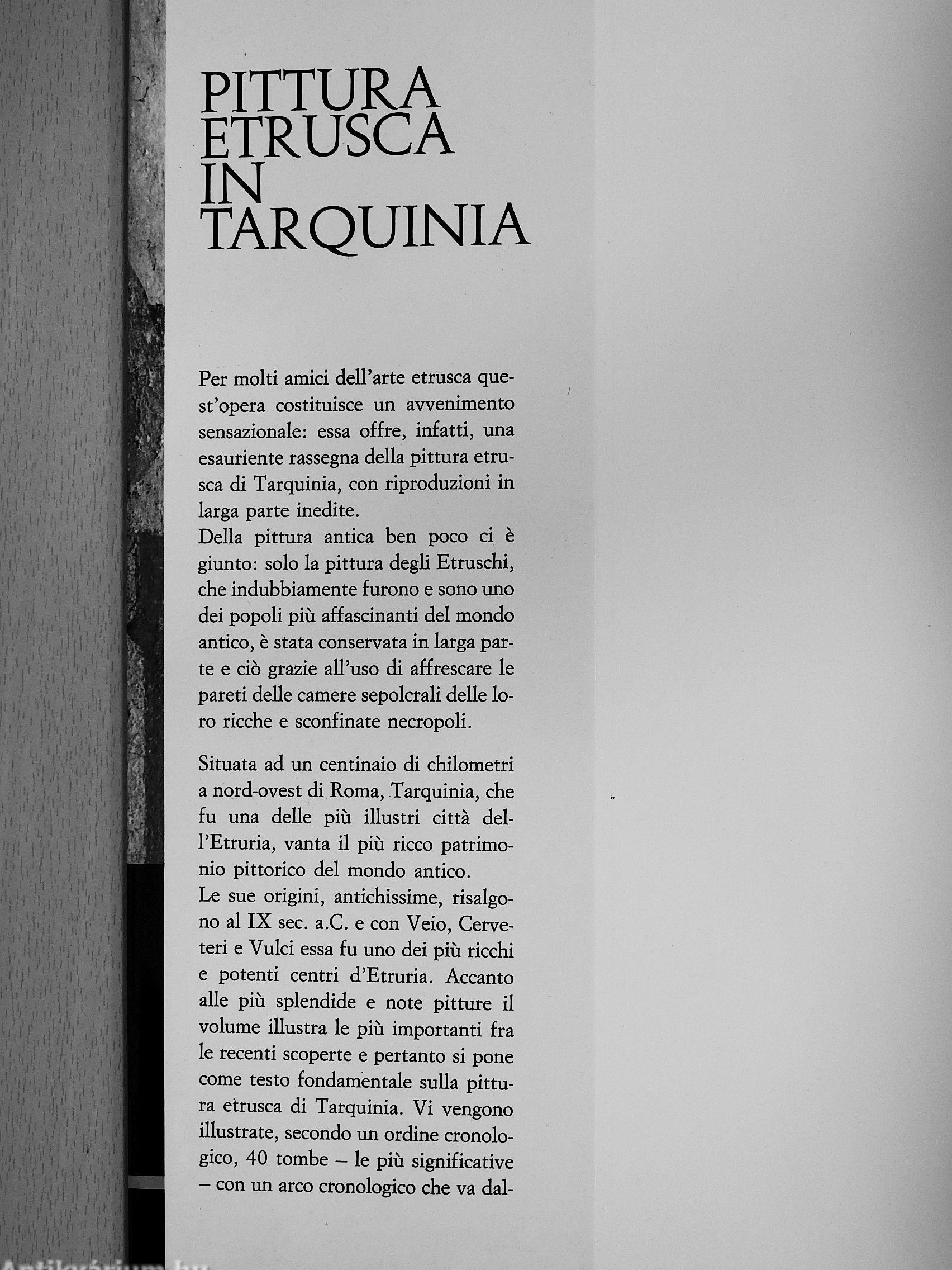 Per molti amid dell'arte etrusca que-st'opera costituisce un awenimento sensazionale: essa offre, infatti, una esauriente rassegna della pittura etrusca di Tarquinia, con riproduzioni in larga parte inedite. Della pittura antica ben poco ci e giunto: solo la pittura degli Etruschi, che indubbiamente furono e sono uno dei popoli piu affascinanti del mondo antico, e stata consérvala in larga parte e ció grazie all'uso di affrescare le pareti delle camere sepolcrali delle loro ricche e sconfinate necropoli.