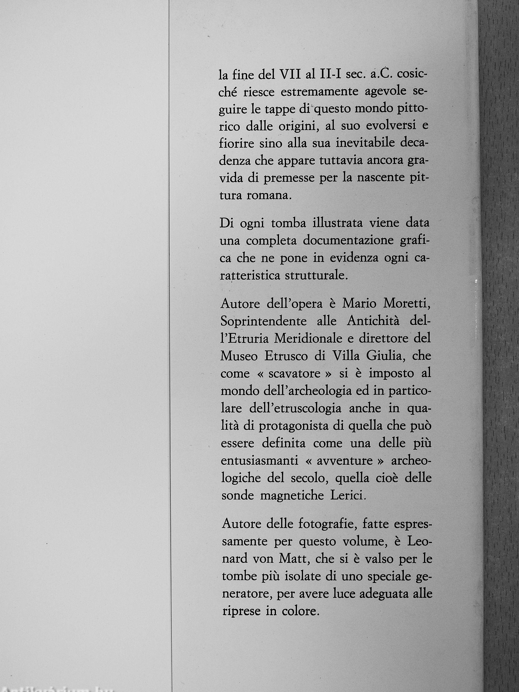 Autore dell'opera e Mario Moretti, Soprintendente alie Antichita del-l'Etruria Méridionale e direttore del Museo Etrusco di Villa Giulia, che come « scavatore » si e imposto al mondo dell'archeologia ed in particolare dell'etruscologia anche in qualité di protagonista di quella che puo essere definita come una delle piu entusiasmanti « avventure » archeo-logiche del secolo, quella cioe delle sonde magnetiche Lerici.