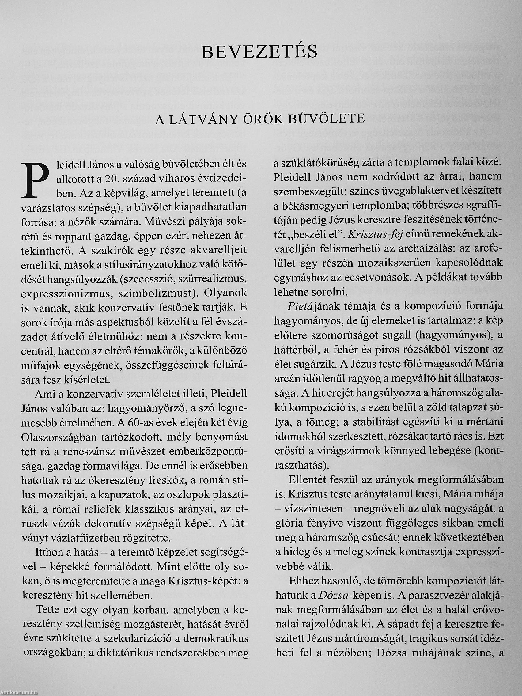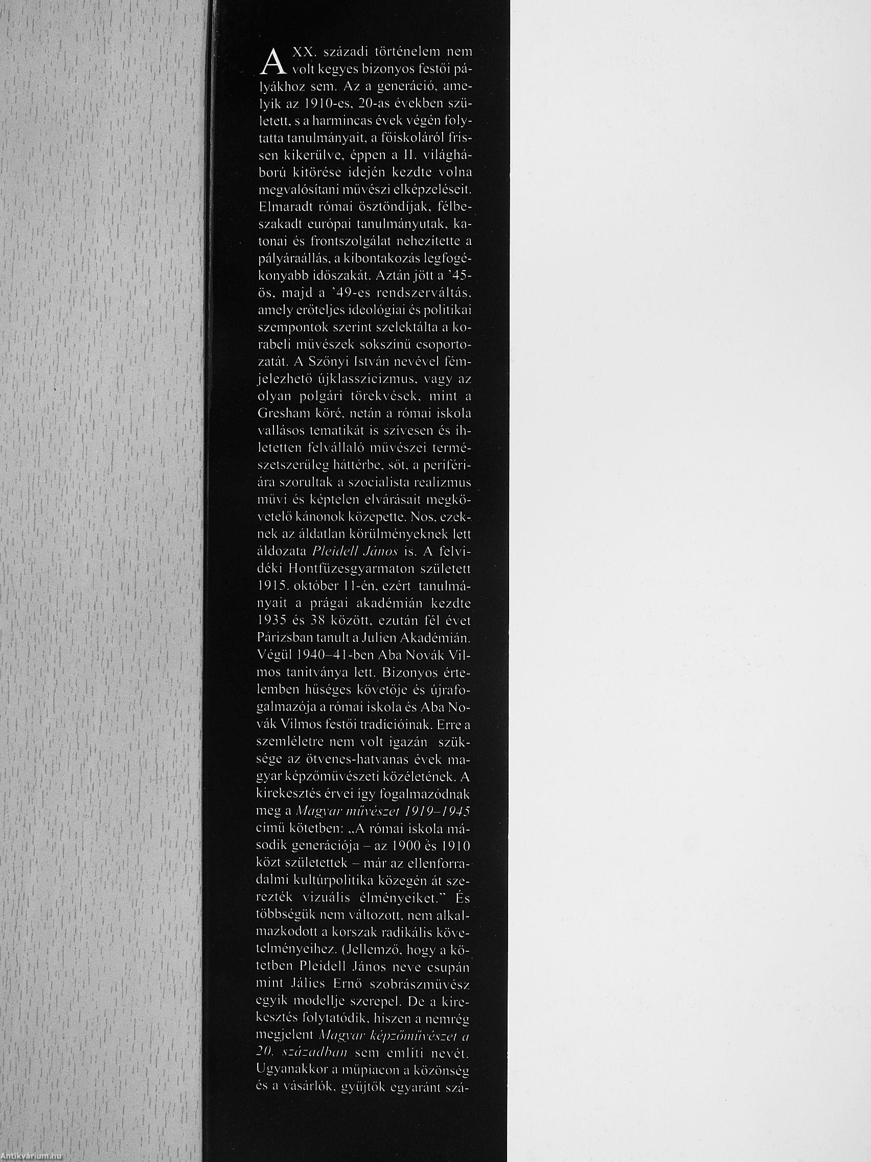 ara szorullak a szocialista realizmus mii\'i és képtelen eKárásait megkö-\ elelő kánonok közepette. Nos. ezeknek az áldallan körülményeknek lett áldozata PleidcH János is. A felvidéki Honifüzesgyarmaton született 1915. október 11-én. ezért tanulmányait a prágai akadémián kezdte 1935 és 38 közölt, ezután fél évet Párizsban tanult a .lulien Akadémián. X'égül 1940-41 -ben Aba No\ák ViI-mos tanit\ánya lett. Bizonyos értelemben hűséges követője és újra fogalmazója a római iskola és Aba No-\'ák Vilmos festői tradícióinak. Erre a szemléletre nem volt igazán szüksége az ötvenes-hatvanas évek magyar képzőművészeti közéletének. A kirekesztés ér\ ei így fogalmazódnak meg a Magyar miivcszci !919-1945 című kötetben: A római iskola második generációja - az 1900 és 1910 közt születettek - már az ellenforradalmi kultúrpolitika közegén át szerezték \izuális élményeiket." És többségük nem váliozott. nem alkalmazkodott a korszak radikális kö\e-telményeihez. (.lellemzö. hogy a kötetben Pleidell .lános ne\e csupán mint .lálics Ernő szobrászmű\ész egyik modellje s/erepel. De a kirekesztés Iblytalódik. his/en a nemrég megiclent Magyar képzöiuiivészci a 20. századhan sem emiili ne\él. Ugyanakkor a műpiacon a közönség és a \ ásárlók. gyűjtők egyaránt szá- Vissza