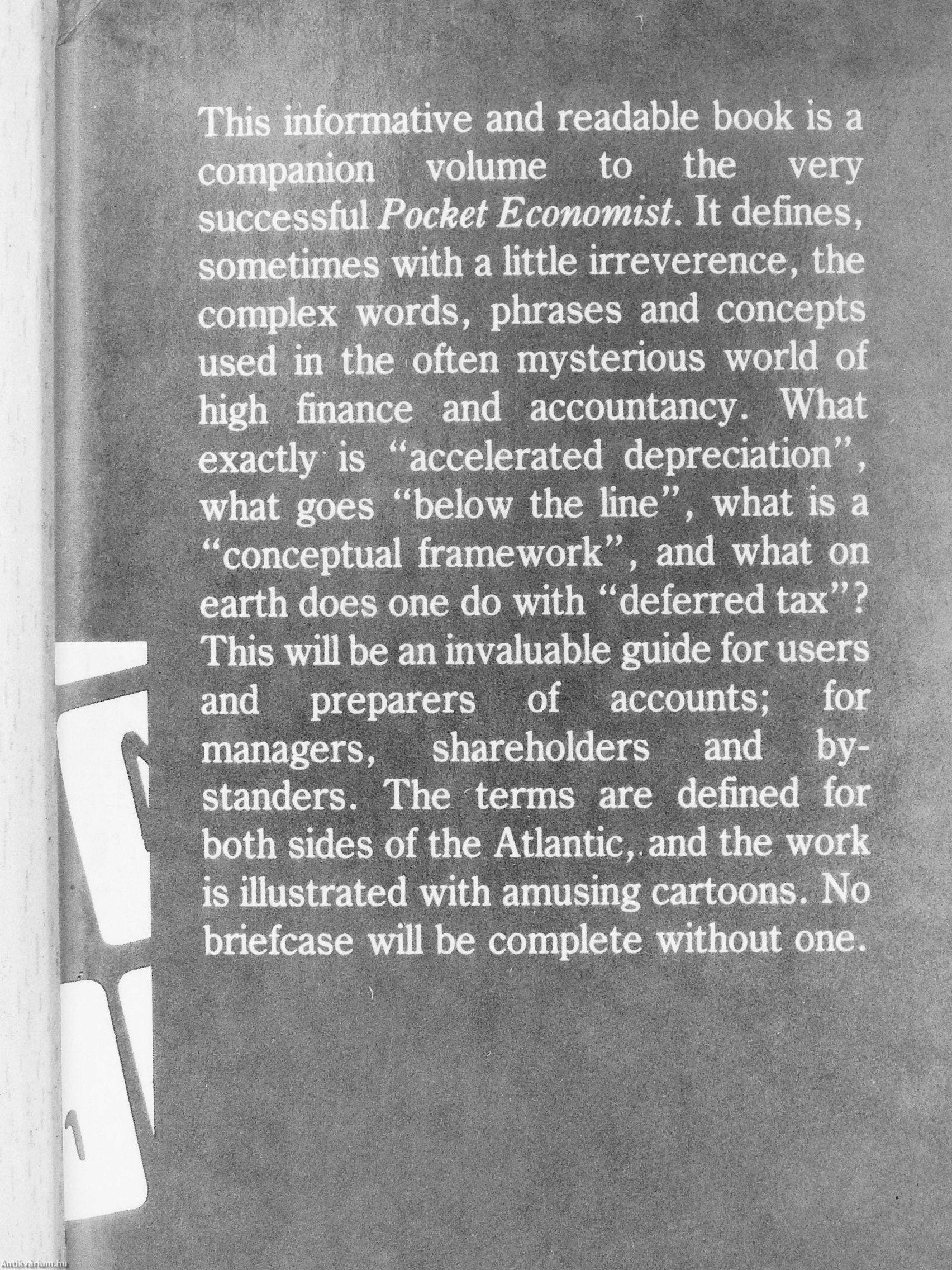 This informative and readable book is a companion volume to the very Pocket Economist. It defines, sometimes with a little irreverence, the complex words, phrases and concepts used in the often mysterious world of high finance and accountancy. What exactly is "accelerated depreciation", what goes "below the line", what is a "conceptual framework", and what on earth does one do with "deferred tax"? This will be an invaluable guide for users and preparers of accounts; for managers, shareholders and bystanders. The terms are defined for both sides of the Atlantic, and the work is illustrated with amusing cartoons. No briefcase will be complete without one.