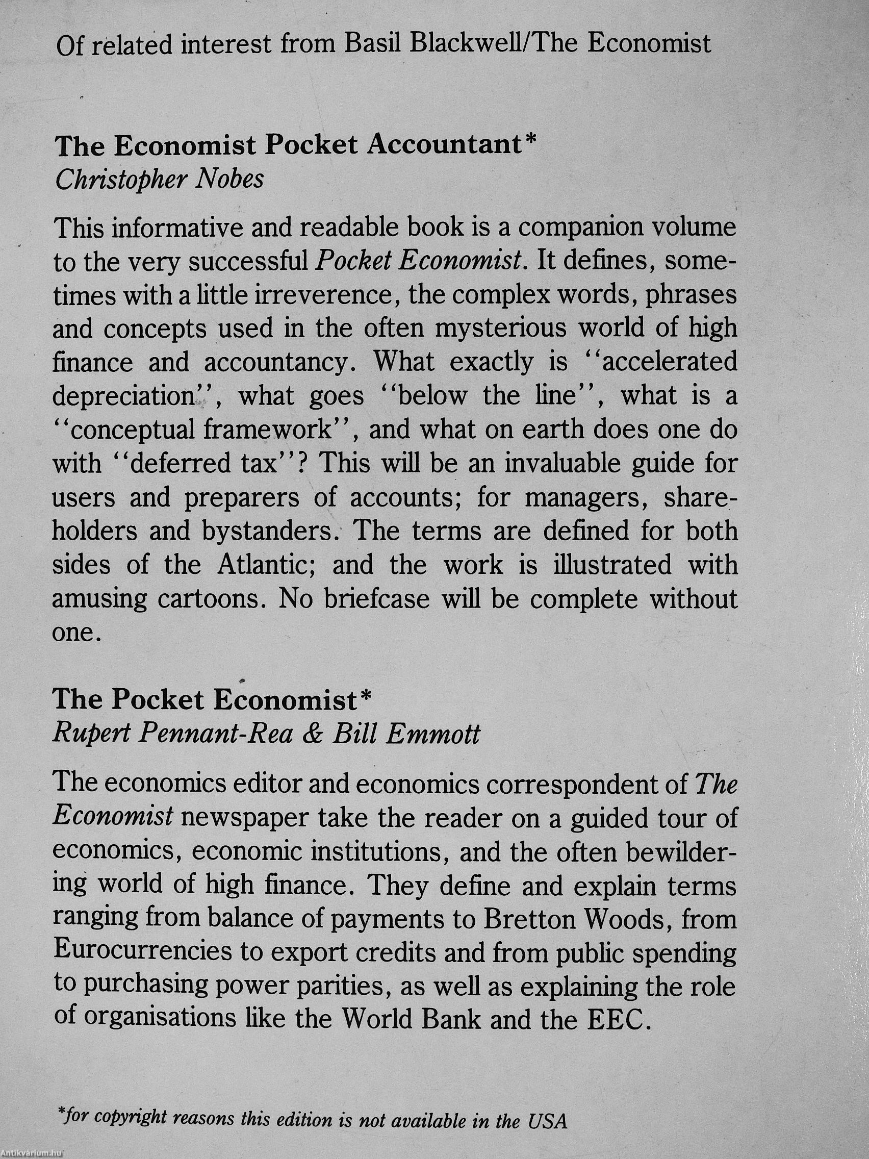 This informative and readable book is a companion volume to the very successM Pocket Economist. It defines, sometimes with a little irreverence, the complex words, phrases and concepts used in the often mysterious world of high finance and accountancy. What exactly is "accelerated depreciation", what goes "below the line", what is a "conceptual framework", and what on earth does one do with "deferred tax"? This will be an invaluable guide for users and preparers of accounts; for managers, shareholders and bystanders. The terms are defined for both sides of the Atlantic; and the work is illustrated with amusing cartoons. No briefcase will be complete without one.