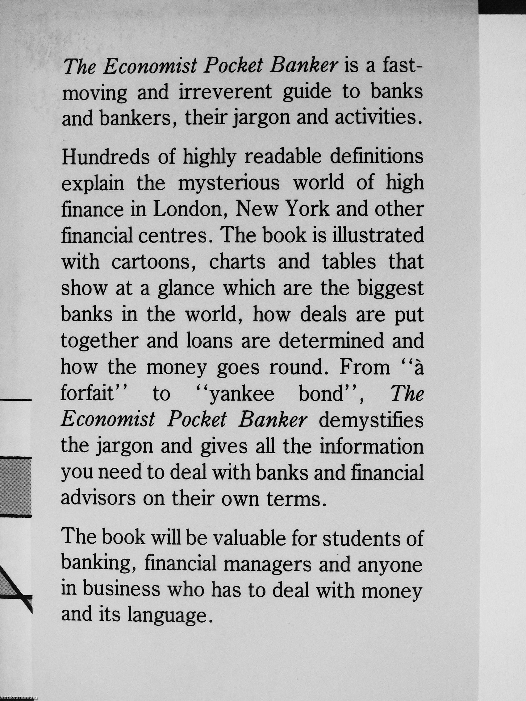 Hundreds of highly readable definitions explain the mysterious world of high finance in London, New York and other financial centres. The book is illustrated with cartoons, charts and tables that show at a glance which are the biggest banks in the world, how deals are put together and loans are determined and how the money goes round. From ''a forfait" to "yankee bond", The Economist Pocket Banker demystifies the jargon and gives all the information you need to deal with banks and financial advisors on their own terms.