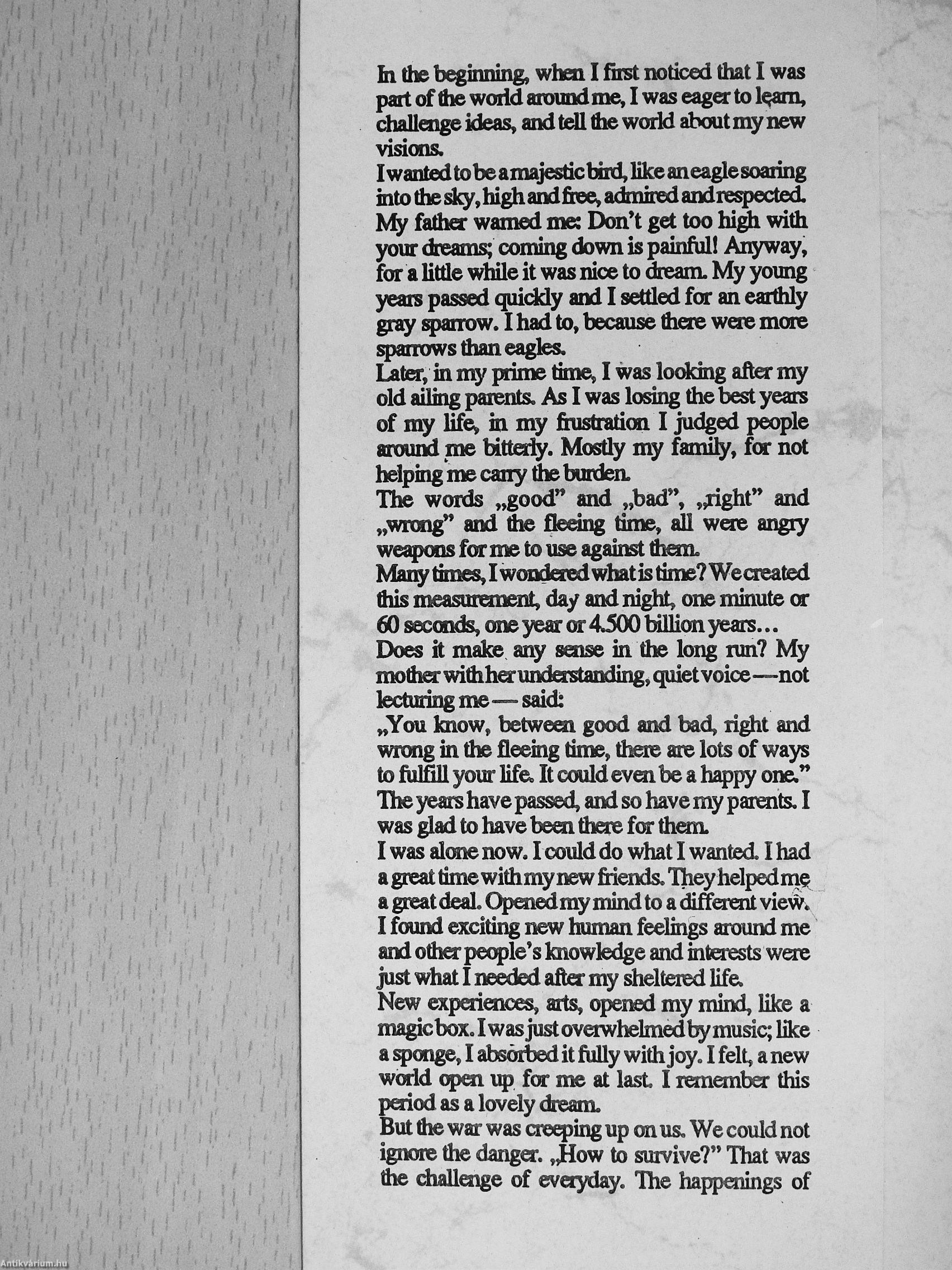Lata; in nty prime time, I was looking after my old aUing parents. As I was loâng the best years of my life, in my fiustration I judged people around me bittafy. Mostly my family, for not helping me cany die burden. The words „good" and „bad", „right" and „wrong" and ttie fledng time, all weie angry weipxis for me to use against fiimL Ma^times,IwoadaedwhatistimB?WecieatBd Oiismeasuronent, day and night, one minute or 60 seconds, one year or4500 IMon years Does it make any sense...