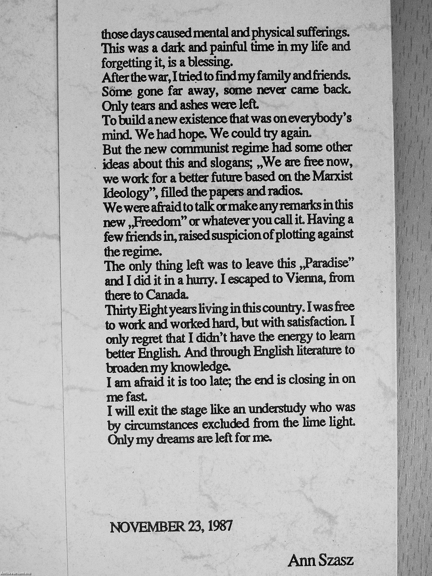 „You know, between good and bad, ri^t and vaong in the fleeing time, there are lots of ways to fulfill your life. It could even be a happy one." The years have passed, and so have my parents. I was glad to have been theare for them. I was alone now. I could do what I wanted I had a great time withmy new Mends. They helpednie a great deal. Opoiedmymindto adiffCTOit vieW. I found exciting new human feelings around me and ofliCT peq)le's knowledge and intoiests woe just what I needed after nQf sheltered Ufe. New dcpoiaioes, arts, opened my mind, like a mapcbox. I was justoverwhelmedl^music; like a sponge, I absôibed it fiiUy with joy. I felt, a new w«ld open iç for me at last I rononber this period as a lovely dream. But file war was creeping up on us. We could not ignore flie danger. ,Îiow to survive?" That was U» diallenge of everyday. The happaiings of