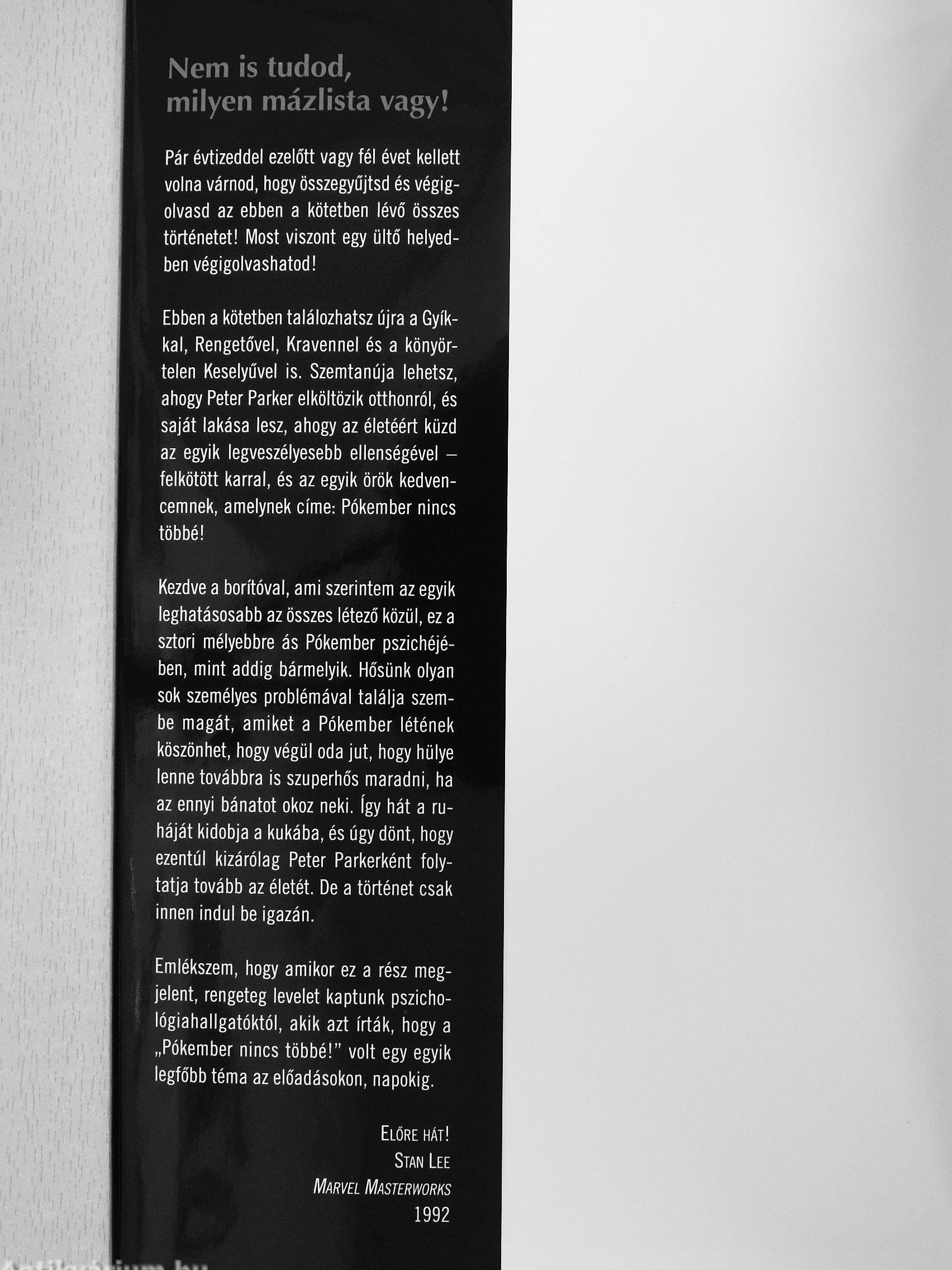 Ebben a kötetben találozhatsz újra a Gyíkkal, Rengetővel, Kravennel és a könyörtelen Keselyűvel is. Szemtanúja lehetsz, ahogy Peter Parker elköltözik otthonról, és saját lakása lesz, ahogy az életéért küzd az egyik legveszélyesebb ellenségével -felkötött karral, és az egyik örök kedvencemnek, amelynek címe: Pókember nincs többé!
