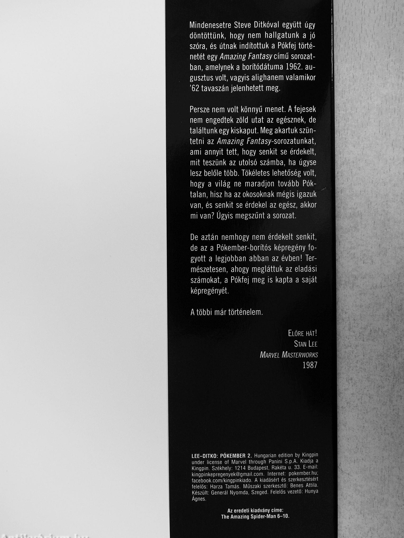 LEE-DITKO: PÓKEMBER 2. Hungarian edition by Kingpin under license of Marvel through Panini S.p.A. Kiadja a Kingpin. Székhely: 1214 Budapest, Rakéta u. 33. E-mail: kingpinkepregenyek@gmail,com. Internet: pokember.hu; facebook.com/kingpinkiado. A kiadásért és szerkesztésért felelős: Harza Tamás. Műszaki szerkesztő: Benes Attila, Készült: Generál Nyomda, Szeged. Felelős vezető: Hunya Ágnes.